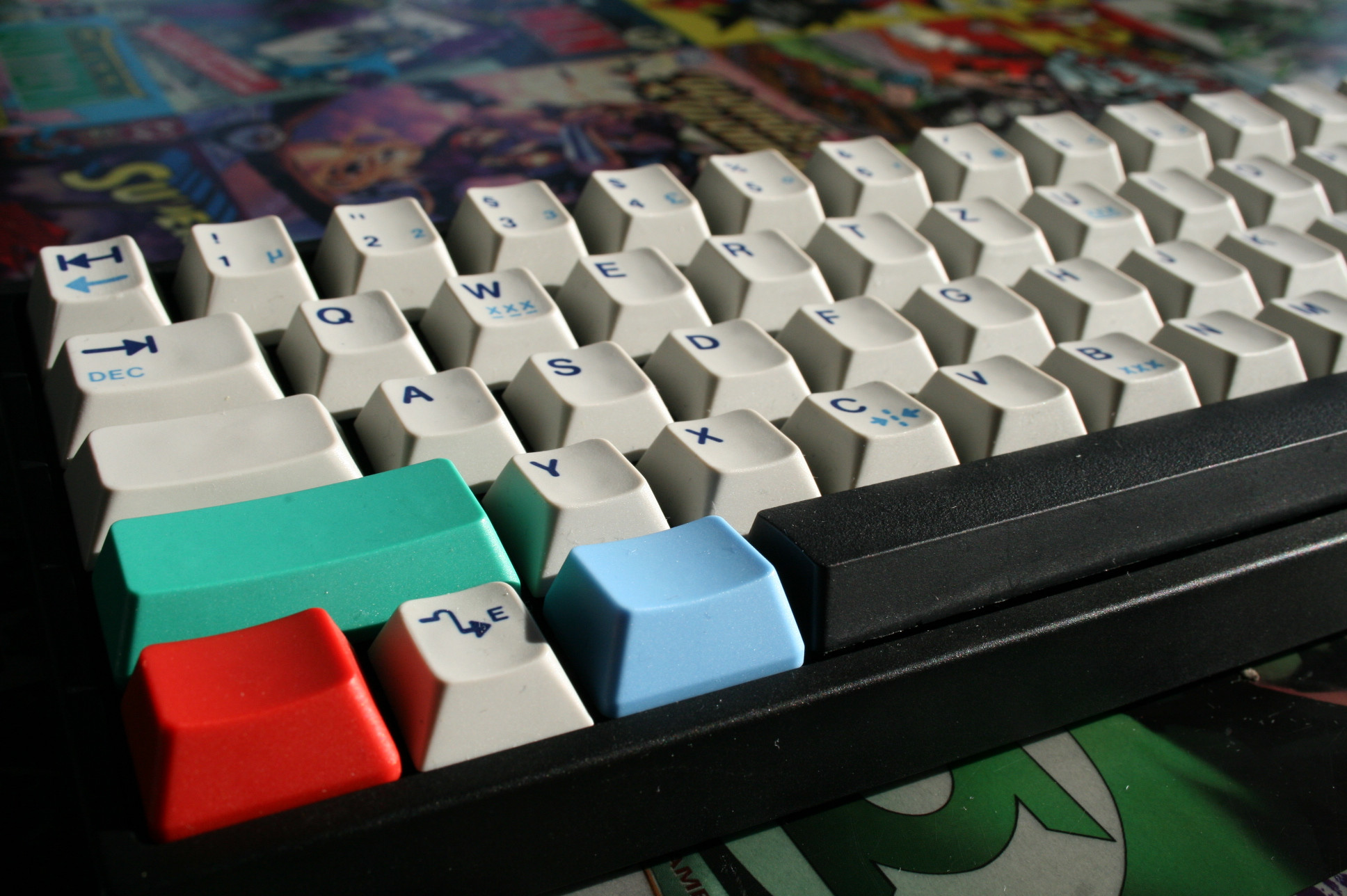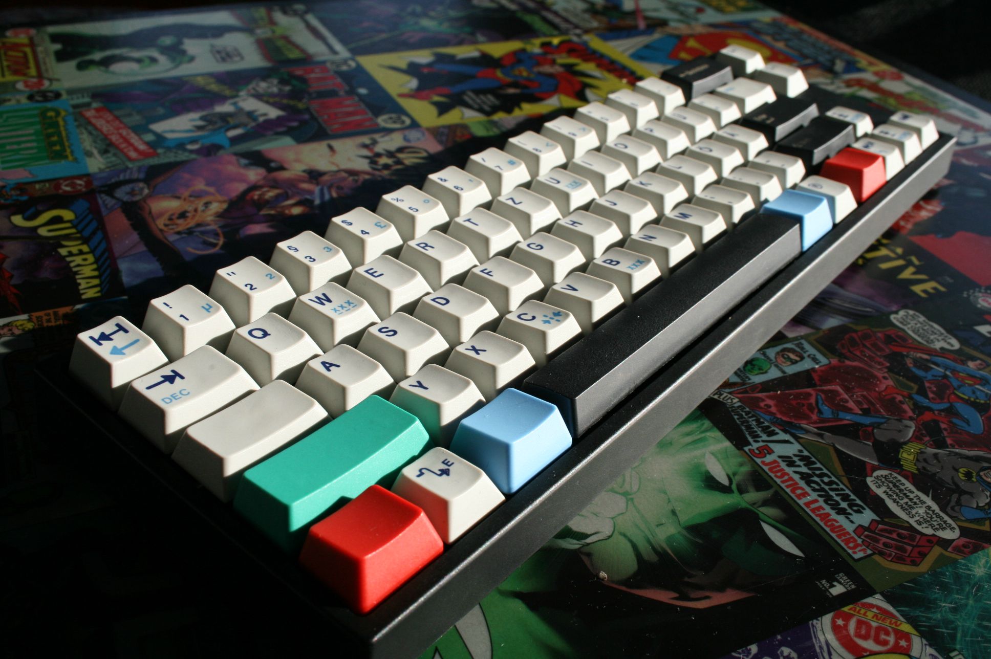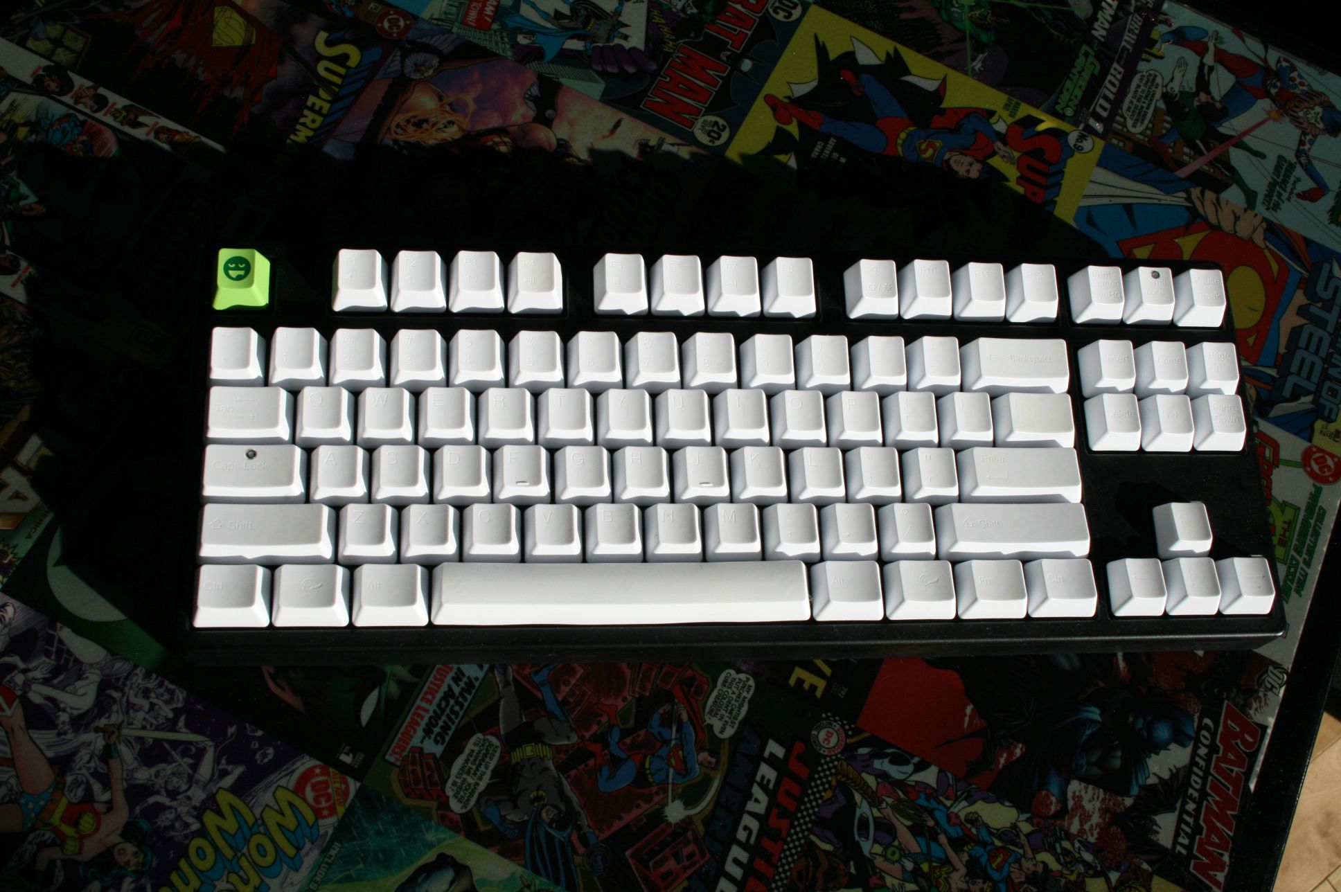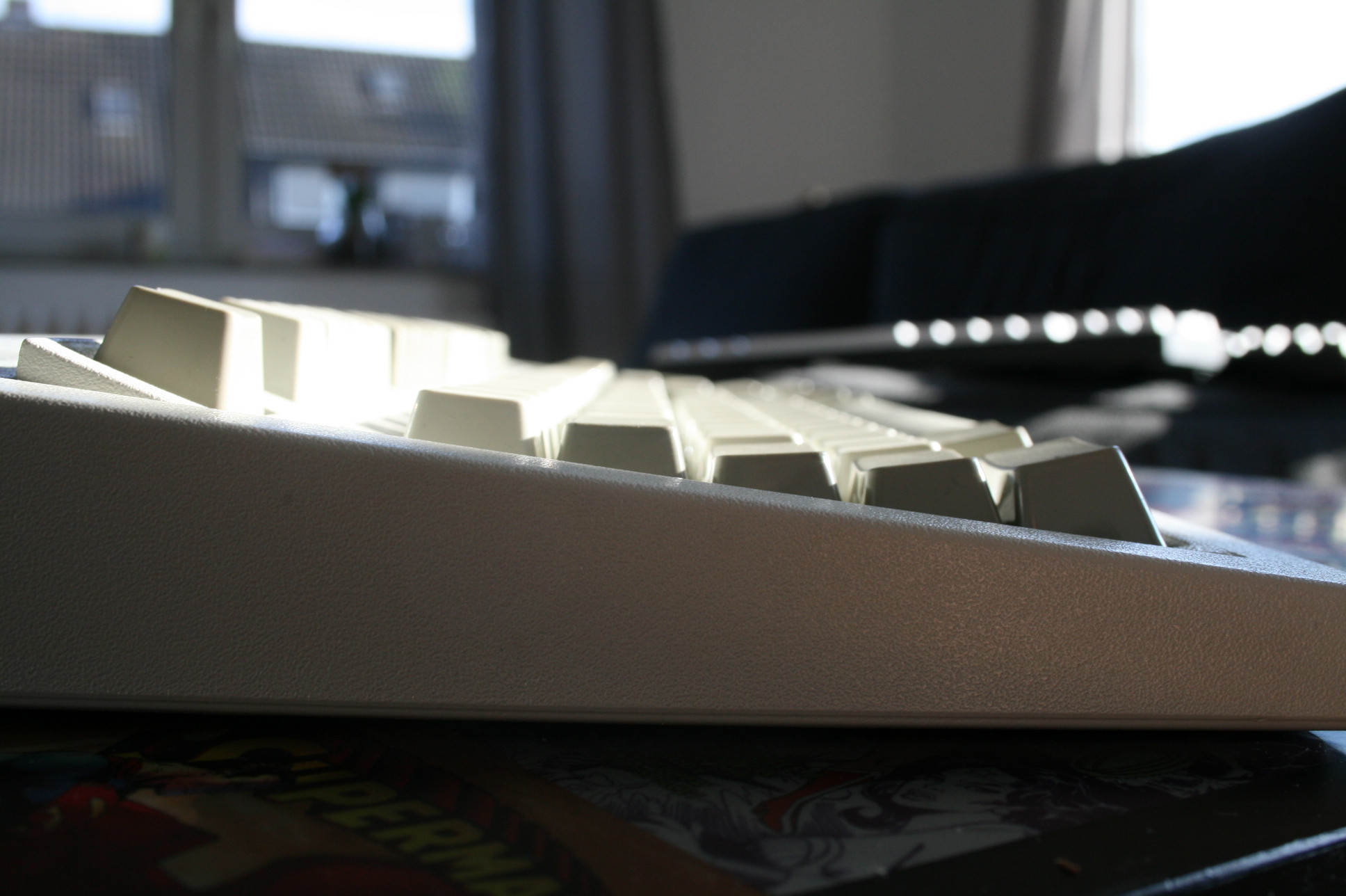 Die hab ich von einer altern Triumph-Adler Schreibmaschine. Daher passen auch im Prinzip nur die Buchstaben/Zahlen richtig, weil so eine Schreibmaschine eben ein komisches Layout hat. Ansonsten kriegst du mit etwas Glück dicke Dyesub PBTs von einer alten Cherry G80 oder G81.