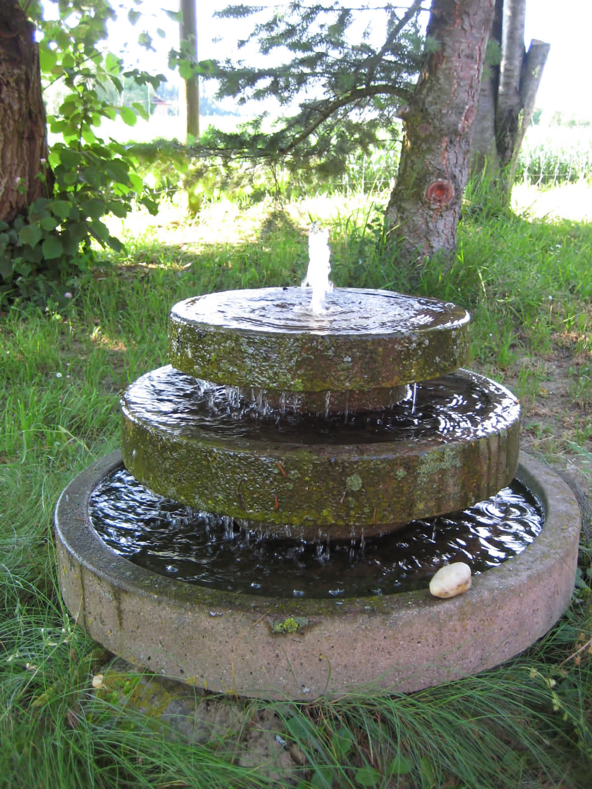 D.h. ich habe das ganze noch erweitert, nämlich von dem kleinen Teich unten einen Schlauch in der Erde zu dem Brunnenkübel gelegt, einen Überlauf am obersten Rand des Kübels gemacht und einen netten Wasserlauf mit der länge nach durchgeflexten Betonröhren verlegt. Also insgesamt zwei kleine geschlossene Wasserkreisläufe, die mit Minipumpen unabhängig voneinander laufen können.