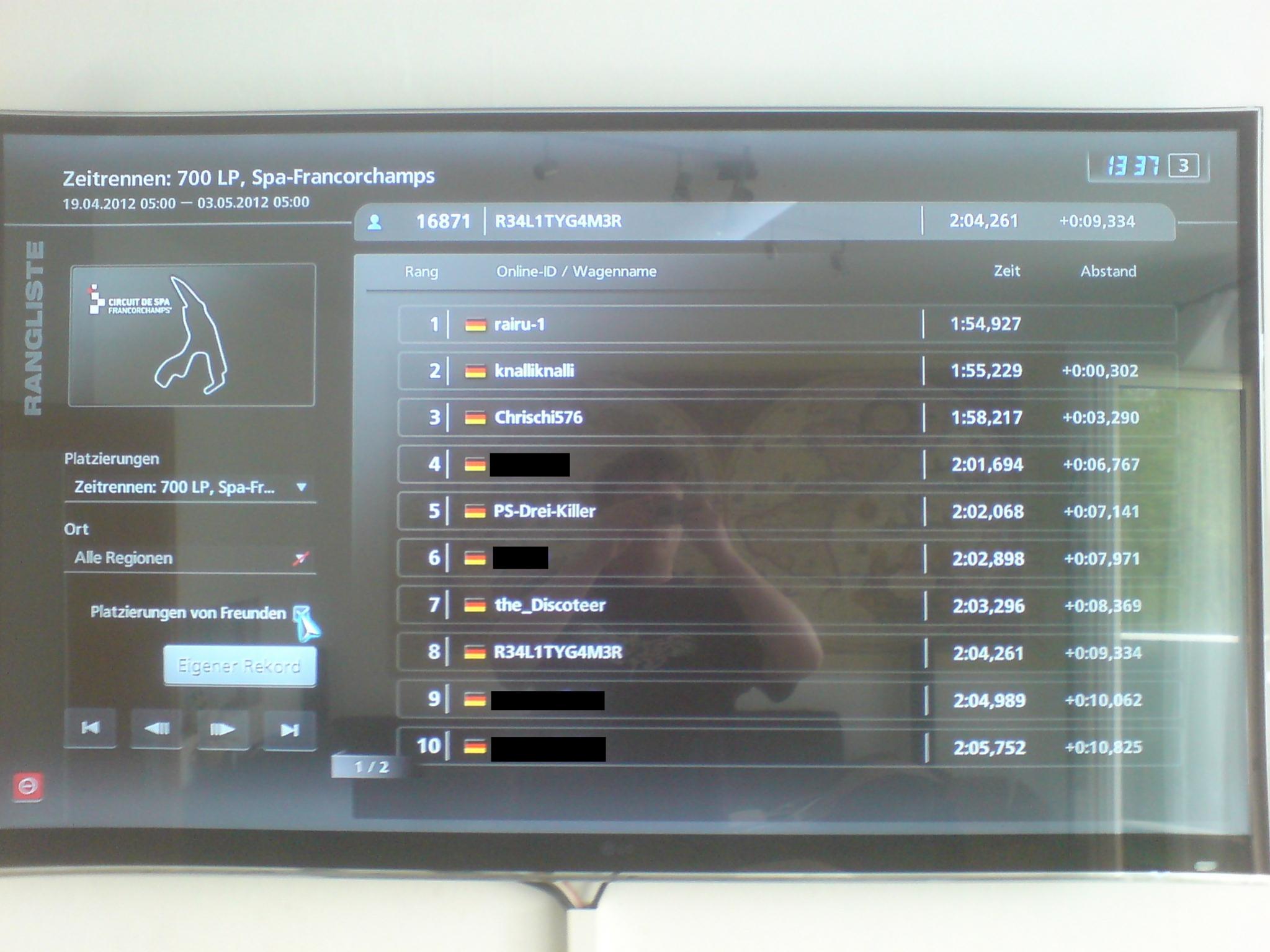 Platz 1: rairu mit 1:54,927 (3. Foto im Anhang Spieler rairu-1) / Preis versendet Platz 2: knalliknalli mit 1:55,229 (3. Foto im Anhang Spieler knalliknalli) Platz 3: Loriot76 mit 1:58,217 (3. Foto im Anhang Spieler Chrischi576) Letzter Platz: Horst_Hoden mit 2:03,296 (3. Foto im Anhang Spieler the_Discoteer) / Preis versendet