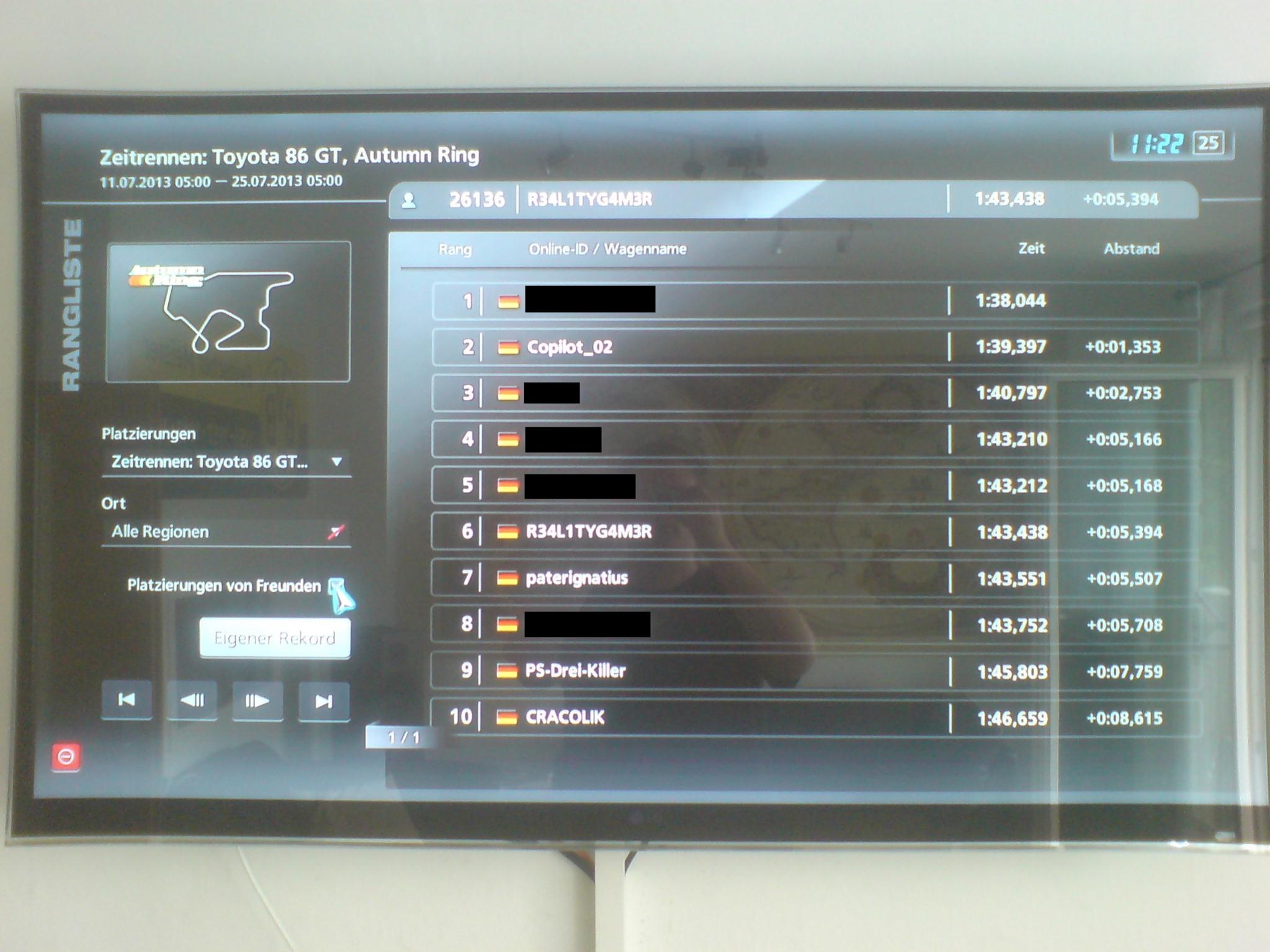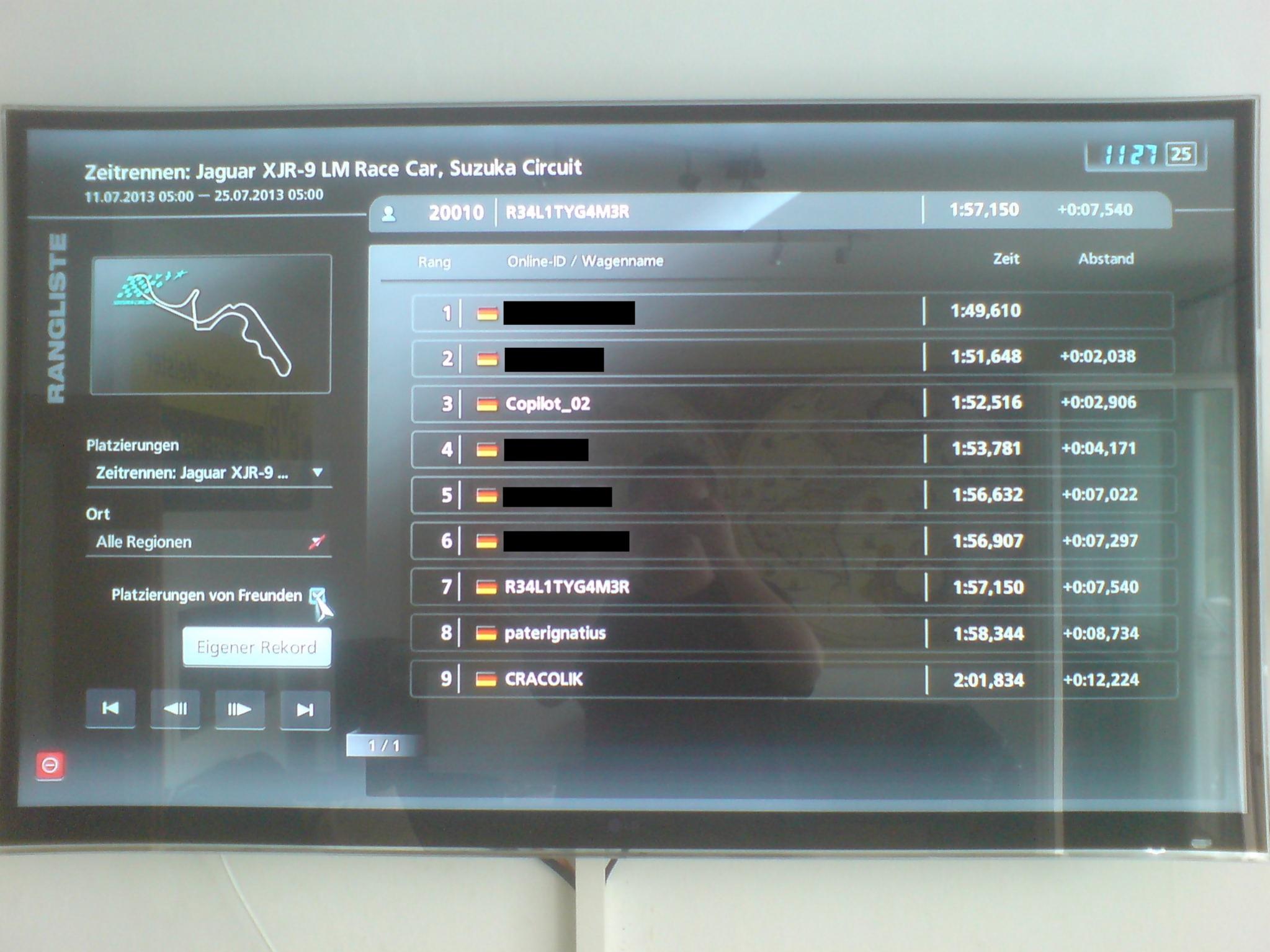 Platz 1: copilot_02 mit 1:39,397 (1. Foto im Anhang Spieler Copilot_02) Platz 2: Yiasmat mit 1:43,438 ===> schuetzenjaeger mit 1:43,551 (1. Foto im Anhang Spieler paterignatius) Platz 3: PS_Drei_Killer mit 1:45,803 (1. Foto im Anhang Spieler PS-Drei-Killer) ===> versendet Letzter Platz: regedit mit 1:46,659 (1. Foto im Anhang Spieler CRACOLIK)