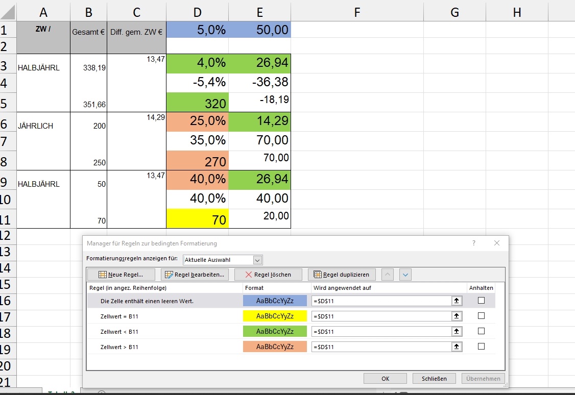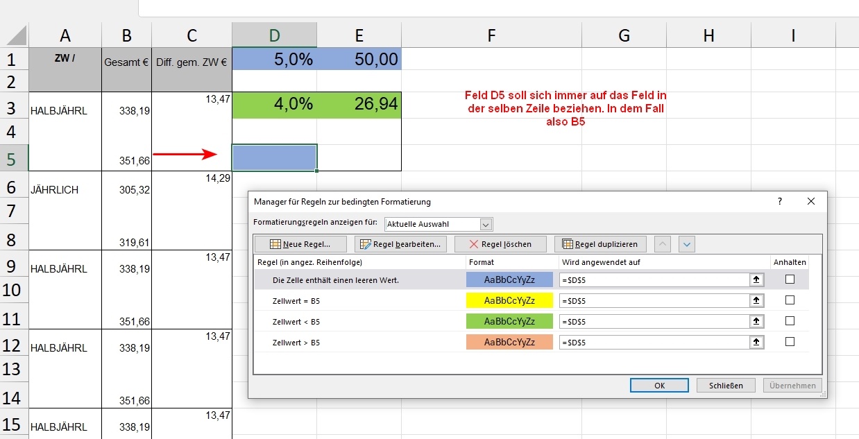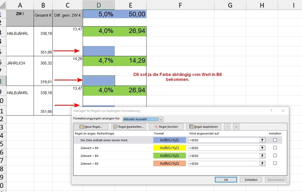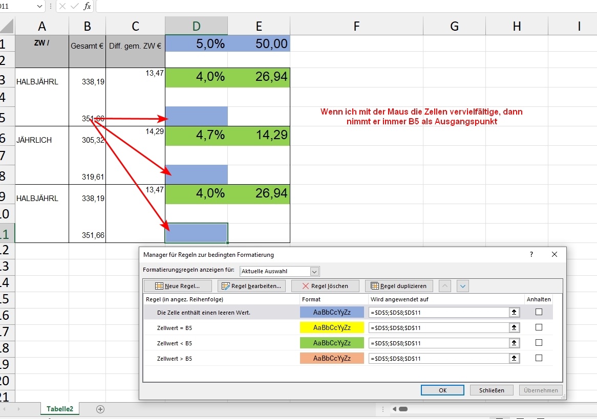 Schau dir immer an, wo er startet. Die Bedingung startet in B5 und die erste Zelle, auf die die Formatierung angewendet wird, ist D5. Hier ist es einfach: Beide Zeilenangaben sind gleich. Wenn er die Bedingung für bspw. D8 berechnen will, dann sieht er D5 -> D8 = 3 Zeilen Unterschied, die er auch auf die Bedingung aufaddiert: B5 + 3 Zeilen = B8. Das gleiche mit D11. Der Unterschied ist D5 -> D11 = 6 Zeilen, also B5 + 6 Zeilen = B11.Mortadello schrieb:Wie kann ich da erkennen, dass D11 nur mit B11 verglichen wird?