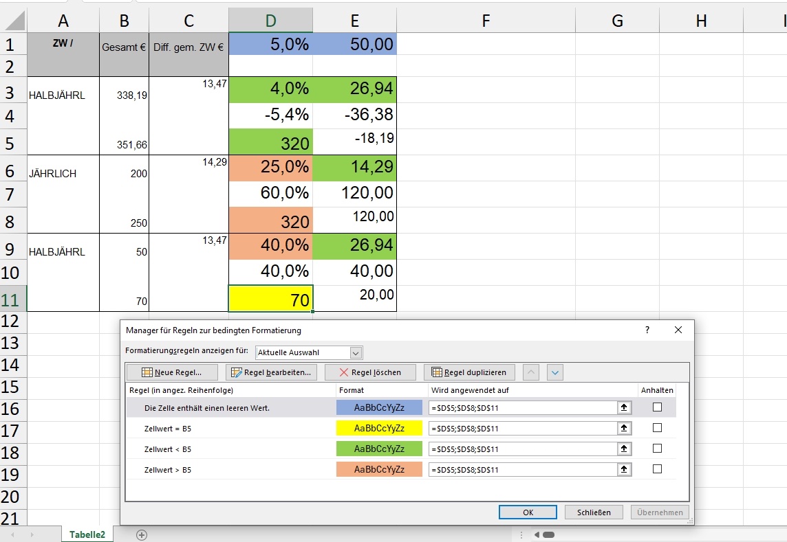 Ich kann ja auf diesem Bild, außer durch ausprobieren, ja gar nicht erkennen, ob sich die Formatierung jetzt auf den Wert in der gleichen Zeile (B11) bezieht oder tatsächlich auf B5