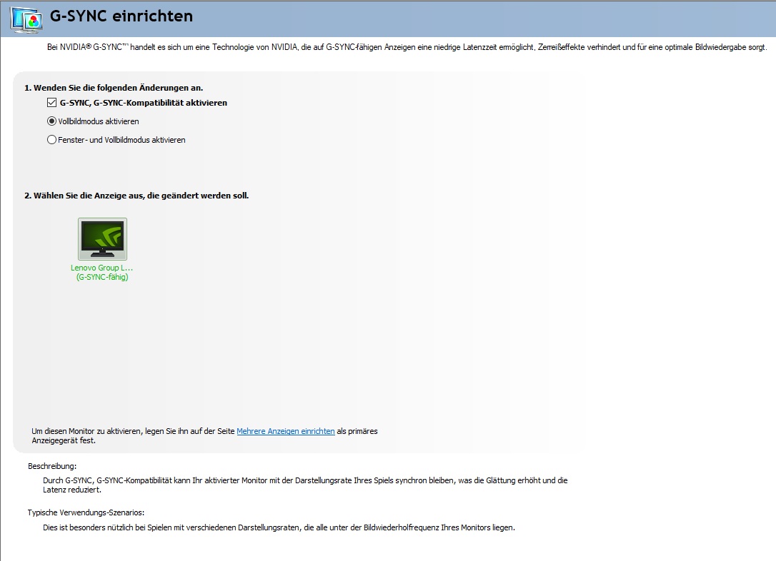 Was mir aufgefallen ist, mir fehlt der 3. Punkt bei G-Sync einrichten (für Monitor übernehmen), den andere bei ihren Erklärvideos oftmals haben, egal ob ein oder zwei Monitore (siehe Screenshot).