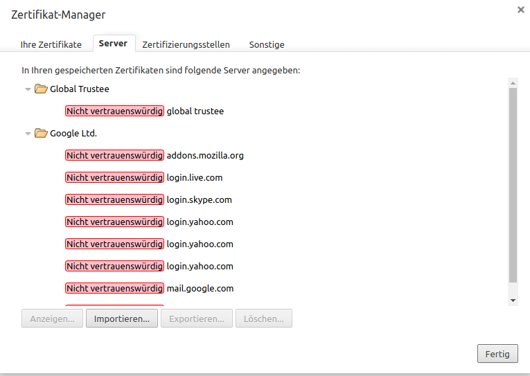 seit einigen Tagen habe Probleme mit meinem Chromium, Vivaldi und Opera Browsern. Denn alle versagen bei den https Webseiten und geben an, dass das Zertifikat nicht in Ordnung wäre, was aber nicht stimmt. Unter Einstellungen sind die Zertifikate als nicht vertrauenswürdig eingestuft. Auch löschen lassen sich diese Zertifikate nicht. Firefox funktioniert mit seinen Zertifikaten ohne Probleme, möchte es aber nicht unbedingt benutzen. An was kann der Fehler liegen?
