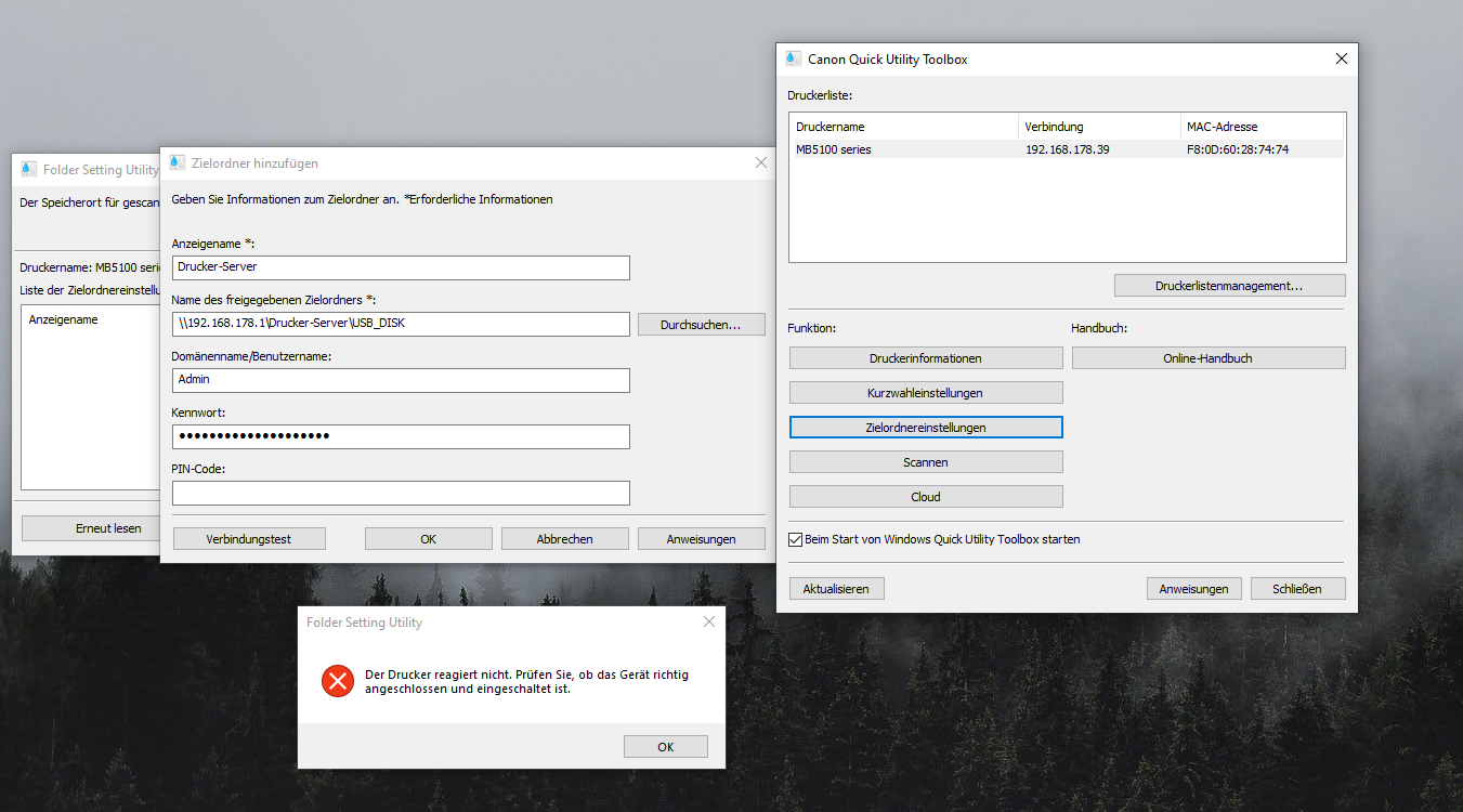 Der Canon MB5150 kann Scans direkt vom Gerät an Zielordner innerhalb eines Netzwerks senden und dort ablegen. Diese Einstellung muss dem Canon aber über ein PC innerhalb des Netzwerks beigebracht werden. Dazu nutzt man Canons "Quick Utility Toolbox" um dem Scanner zu erklären, wo die Scans abgelegt werden. Der Ablageort ist die Fritz-NAS (per eingestecktem USB-Stick).