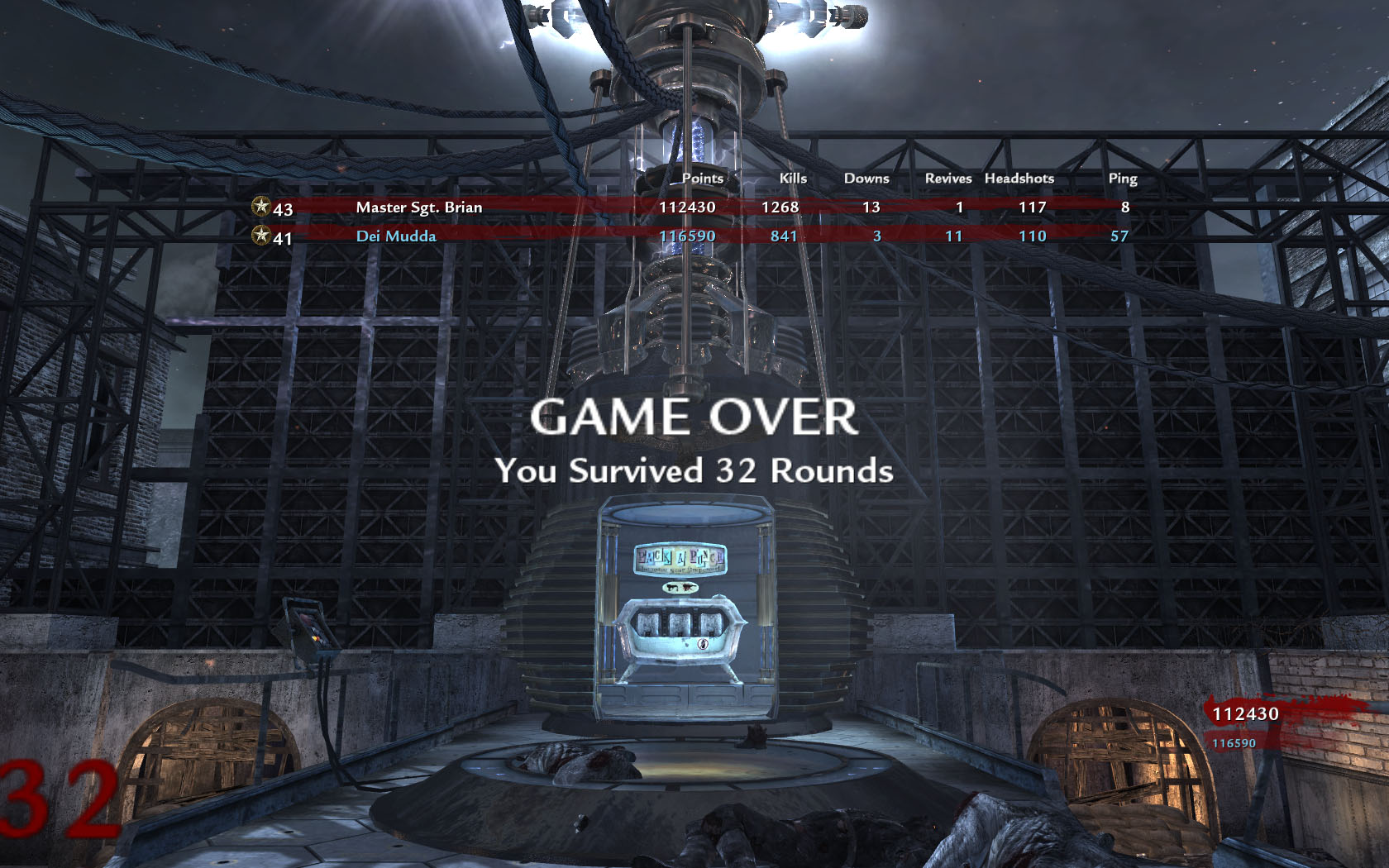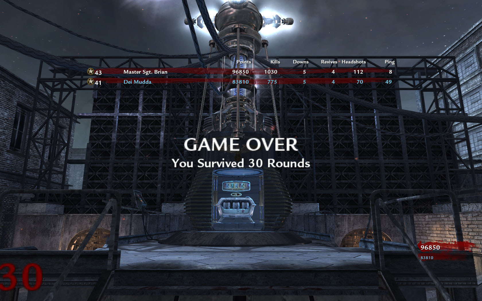 2. Bis Runde 20 - 25 selbe Taktik. Danach beide auf den teleporter und ballern bis es zuviel wird. Dann teleportieren, die kurze Ruhe nutzen um zum nächsten Teleporter zu rennen und das gleich Spiel nochmal. Dabei darauf achten, dass man vom mainframe aus immer abwechseln zu den verschiedenen Teleportern läuft, weil die Zombies immer aus Richtung des vorigen zurücklaufen.
