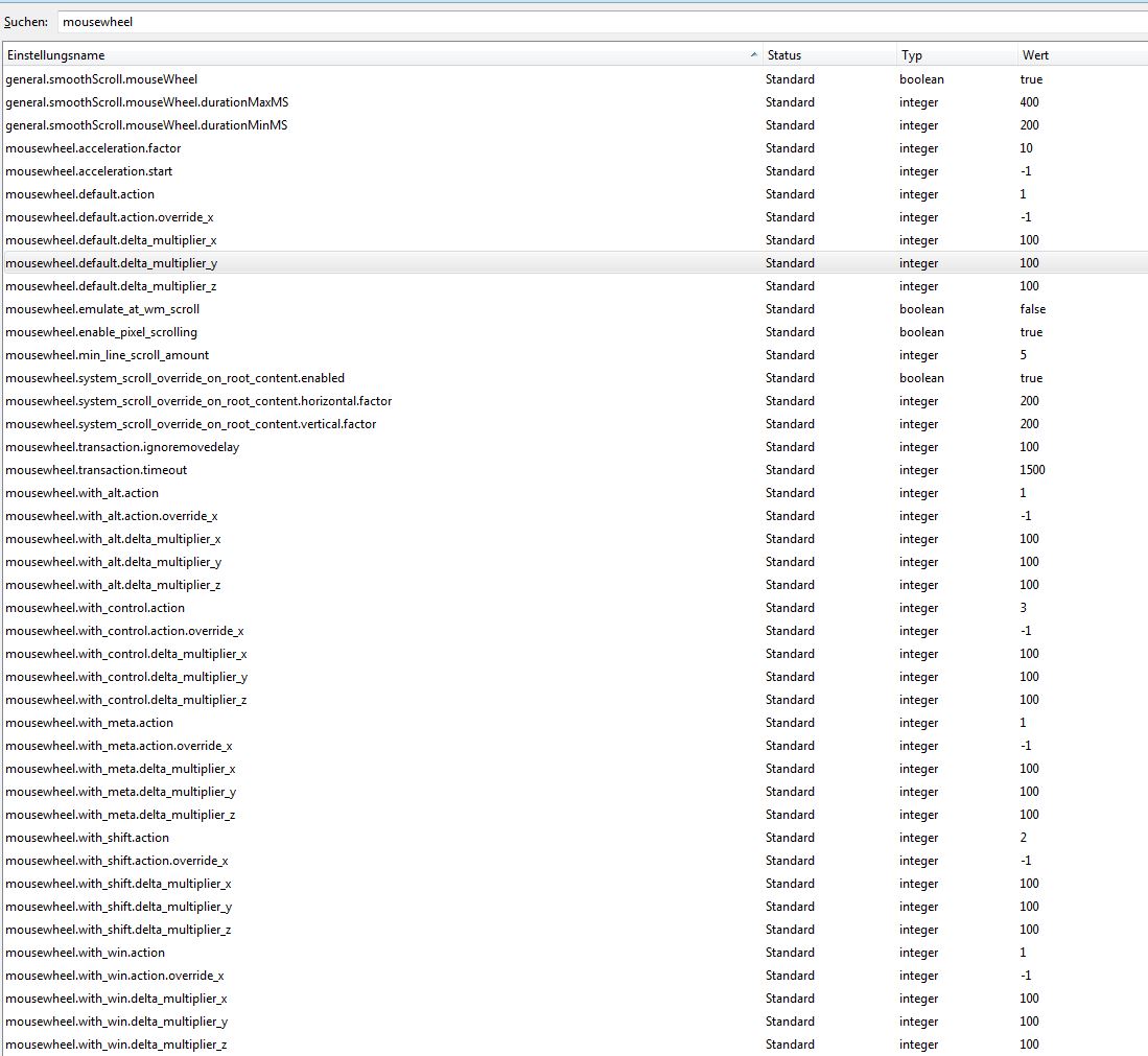 Ich habe in about:config mal nach "mousewheel" gesucht und das Ergebnis in den Anhang gesetzt; ich kann dort leider keinen passenden Eintrag finden.