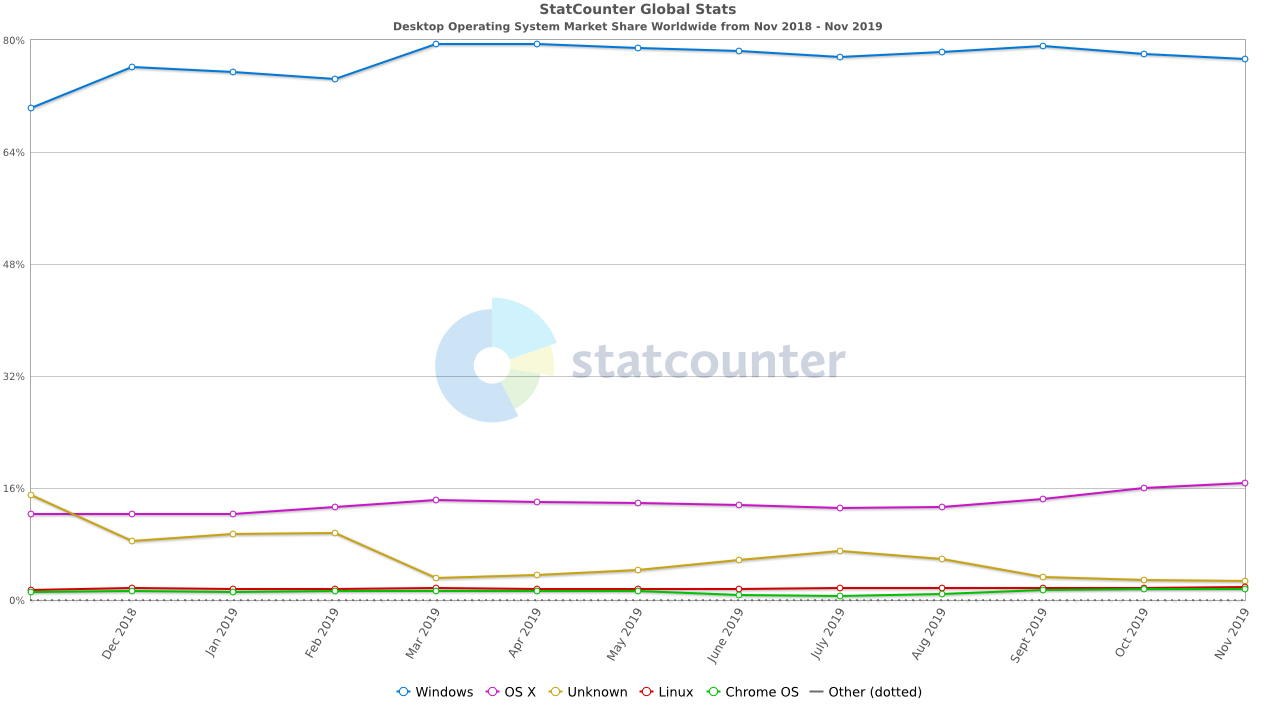 Erstaunlich... nutzt man google (oder Bing oder welche Suchmaschine auch immer), dann findet man uA bei StatCounter Marktwerte von knapp 78% Windows auf Desktop-Produkten, knapp 17% haben ein MacOS drauf und gerade mal 1.79% ein Desktop-Linux.