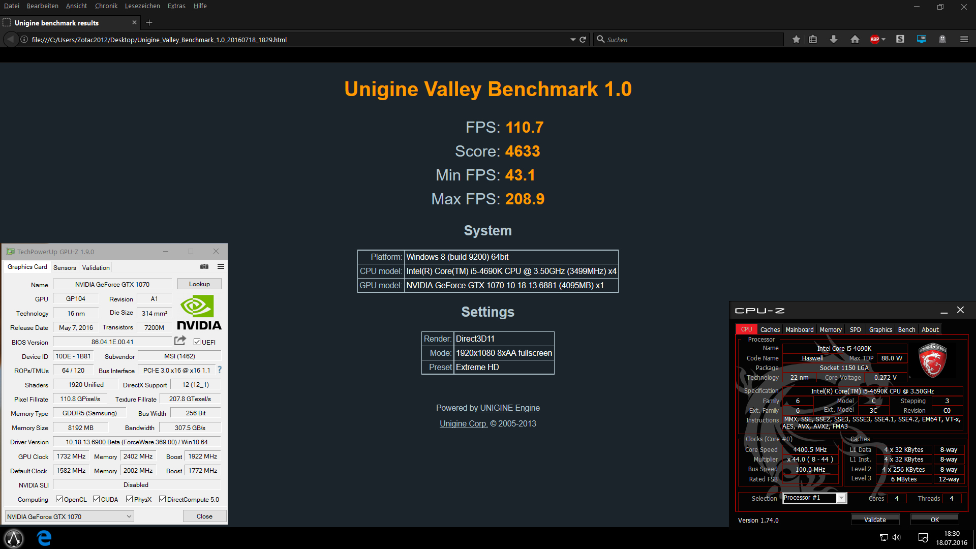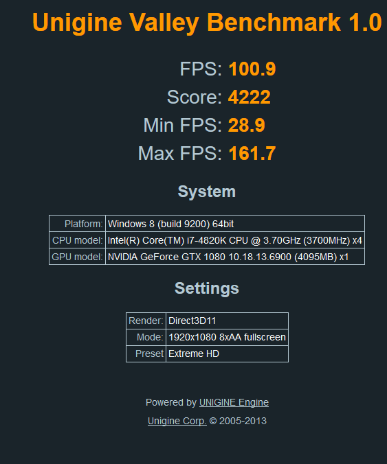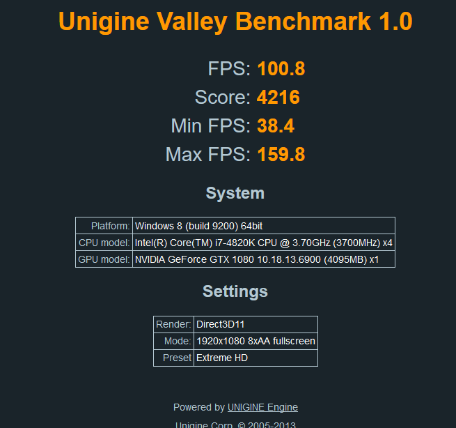 Meine FPS waren bei gleichen Settings durchgehend besser oder wir waren gleichauf. Außerdem trat alle 30 Sekunden ein Stocken des Bildes auf. Das konnte zumindest durch den Geforce Treiber 368.95 behoben werden. Aber nach mehreren durchläufen Unigine Valley Benchmark war die Perfomance immer noch nicht das gelbe vom Ei.