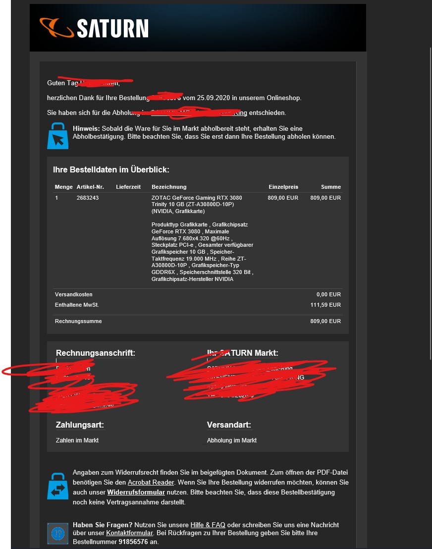 Gerade stand die Zotac bei Saturn auf "Lieferung" in grün, war aber nicht verfügbar. Als ich den Markt ausgewählt habe, stand "im Markt abholen" ebenfalls auf grün. Jedoch war sie nicht verfügbar. Allerdings dachte ich mir, dass hat was zu bedeuten und habe 5 Minuten lang aktualisiert und konnte nun eine erwischen. Alles in Allem ca. 30 Sekunden und dann war sie bestellt. Und nach mir war Lieferung und Abholung wieder grau. Als hätte ich die einzige bekommen.