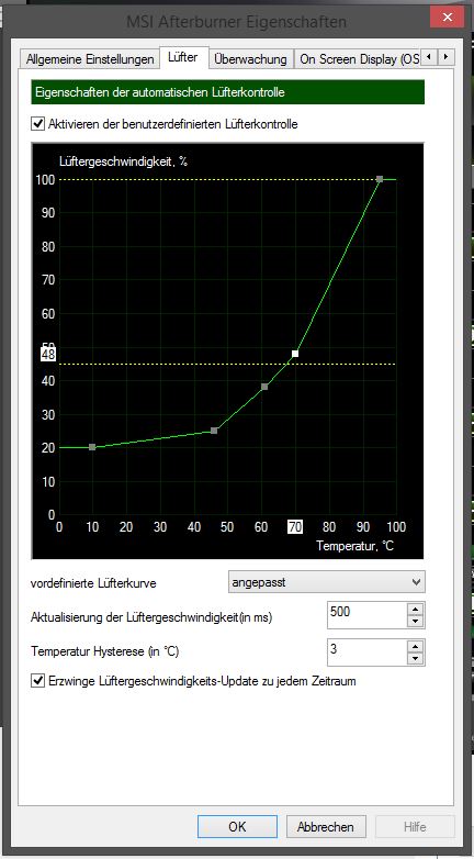 Selbst im Idle/2D-Modus läuft er hörbar auf 45% bei ~28°C. Ich bin mir nicht sicher ob es im BIOS der GraKa so festgeschrieben ist oder ich etwas falsch konfiguriert habe. Auch der MSI Afterburner kann nicht unter diese Grenze (45%) eingestellt werden.