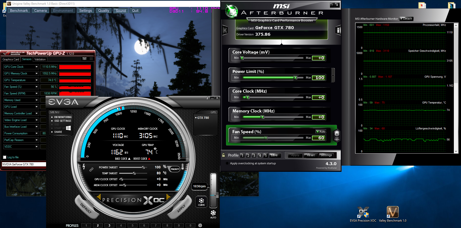 Ich nutze eine Zotac GTX 780 AMP welche standardmäßig mit Core Clock 1.006MHz (Boost 1.059) und Memory Clock 3.105MHz läuft. Ich habe Afterburner 4.3.0 und EVGA Precision X 6.0.9 installiert, mit welchen ich auch bereits diverse OC Einstellungen angetestet habe.