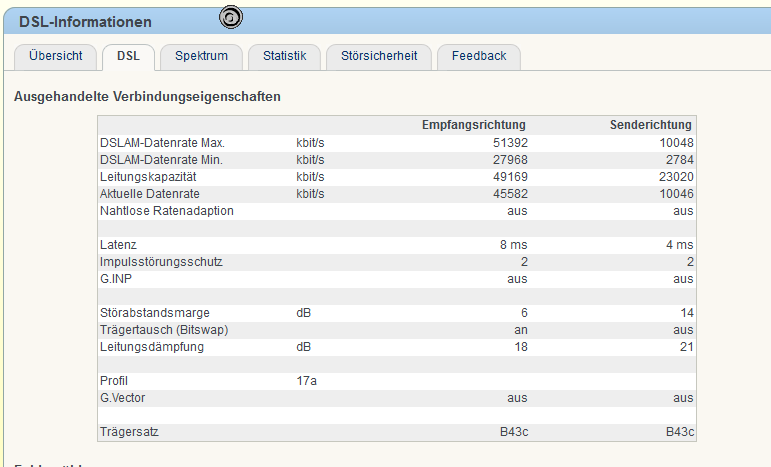 ich hatte ein Problem mit meinem VDSL Anschluss (50Mbit, zu geringe Bandbreite). Der sehr freundliche Mitarbeiter von der Telekom war heute bei mir und hat den Fehler gefunden und behoben. Laut Messung kommt aus der Dose die volle Geschwindigkeit (51393kbit/s). Haben dann wieder meine FB 7490 angeschlossen und dort kommt nur 45Mbit an. Bon der TAE-Dose zum Router (1m Entfernung) gehen 5Mbit verloren.... Die neueste FW ist installiert.