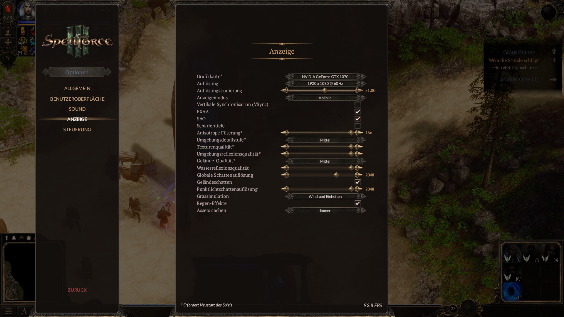 Ich würde mir da mal an deiner Stelle ein Szenarium raussuchen, wo es deiner Meinung nach an irgendwas hapert. Da gehst du kurz raus mit Esc, in die Optionen und zu Anzeige. Die fps der gerade pausierten Szene werden dann unten angezeigt. Du kannst nun sehen, wie sie sich ändern, wenn du die Regler bedienst.