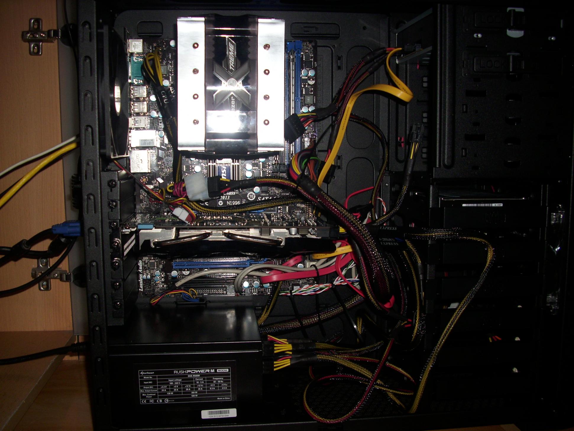 Bei meinem scheiß Gehäuse ist eine ordentliche Verkabelung gar nicht möglich. Da gibt´s keine Möglichkeit, Kabel hinter dem Mainboardtray zu legen. Bald Corsair 600T und Schluss mit Kabelkotze in meinem Gehäuse! <3