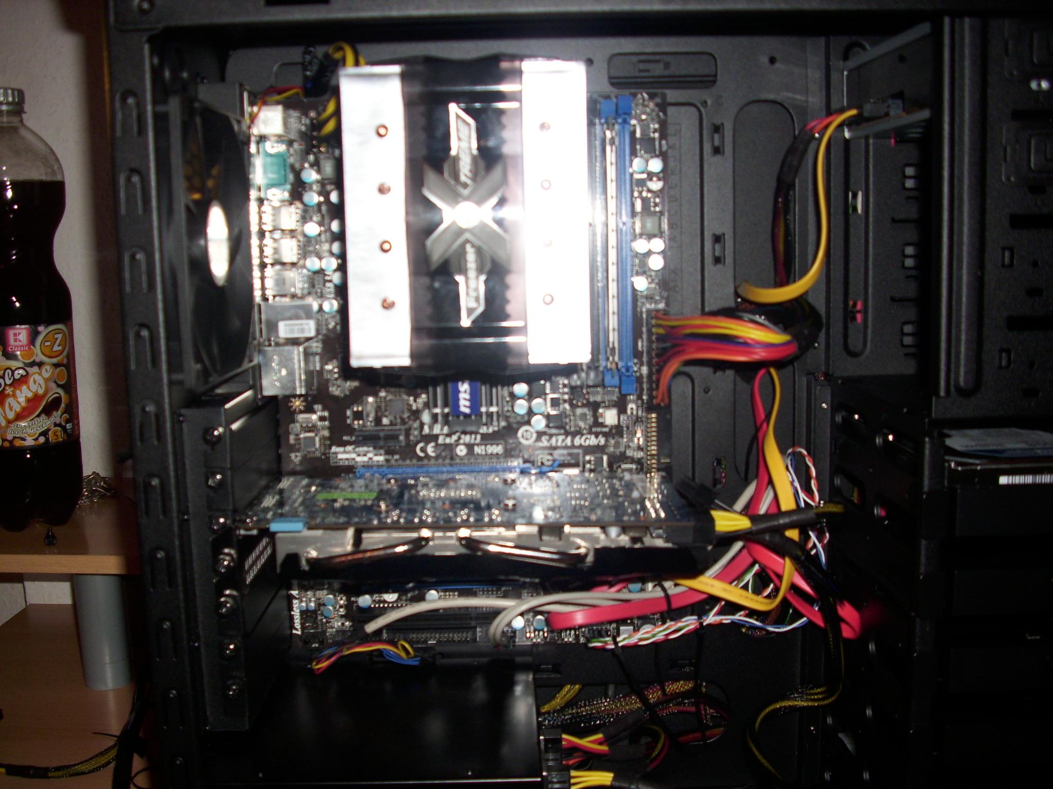 Du musst dir Zeit beim Pc bauen nehmen, dein Gehäuse hat zwei Wände die man raus nehmen kann. Bitte sei doch so lieb und führe den ATX Stecker hinter dem Mainboardtray entlang zu der Buchse. Das sieht schöner aus und verbessert extrem den Airflow, sprich deine CPU wird noch Kühler. Wenn ich dieses Kabelmanagment sehe, kriege ich Augenkrämpfe. Der Witz an der Sache ist ja noch, dass dein Netzteil modular ist. °.°