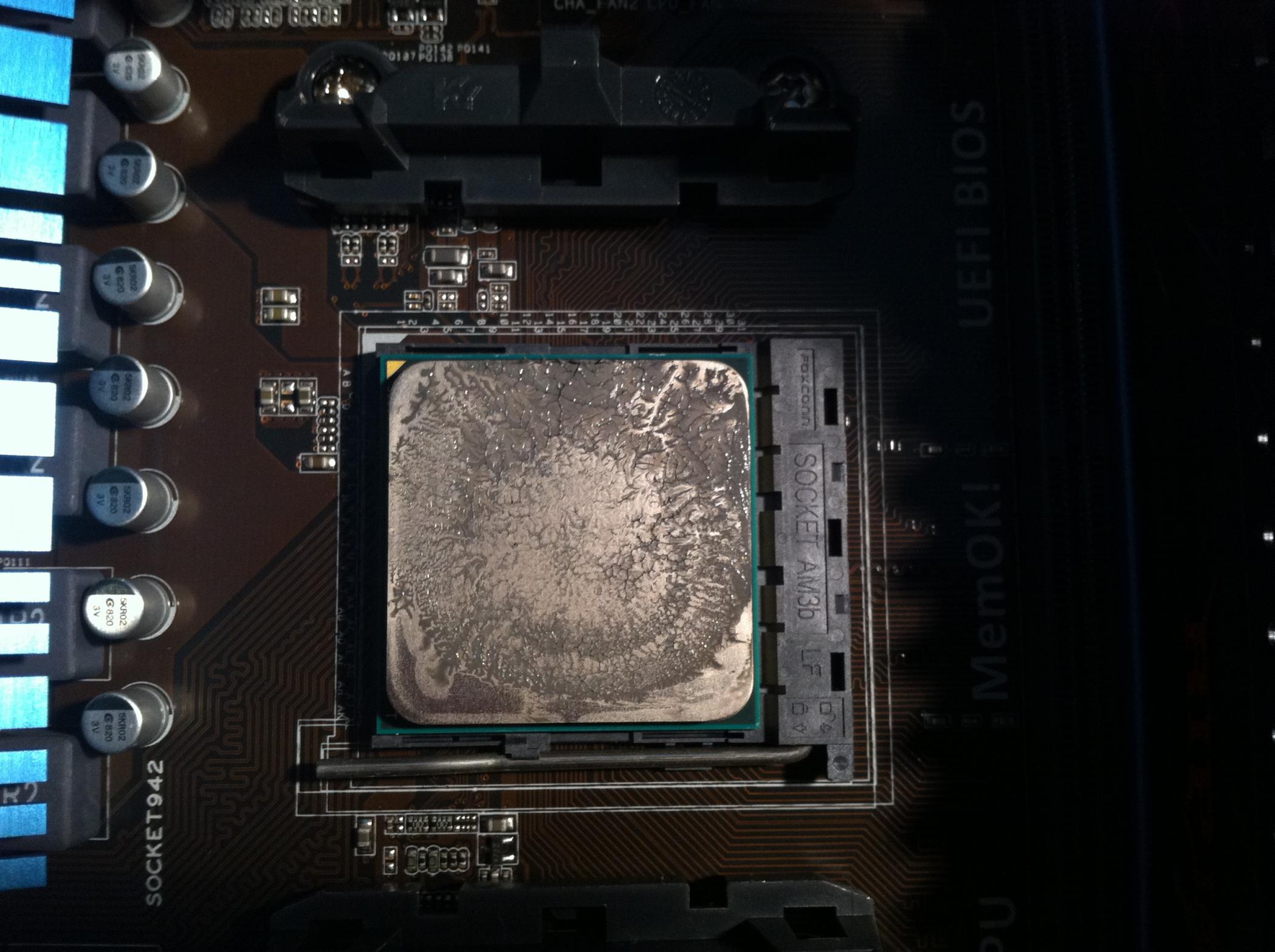 Als erstes dachte ich dass ich vielleicht zu viel oder zu wenig Thermalpaste aufgetragen habe. Nachdem ich den Kühler wieder abmonitert habe, schien dies aber nicht zu Fall zu sein (siehe Fotos). Nun wollte ich mal wissen, ob ihr vieleicht noch ne Idee habt.
