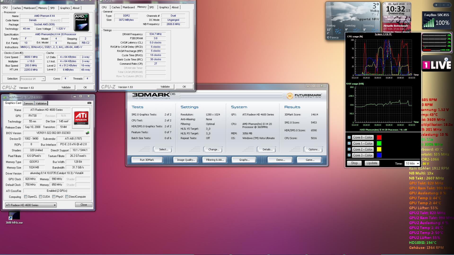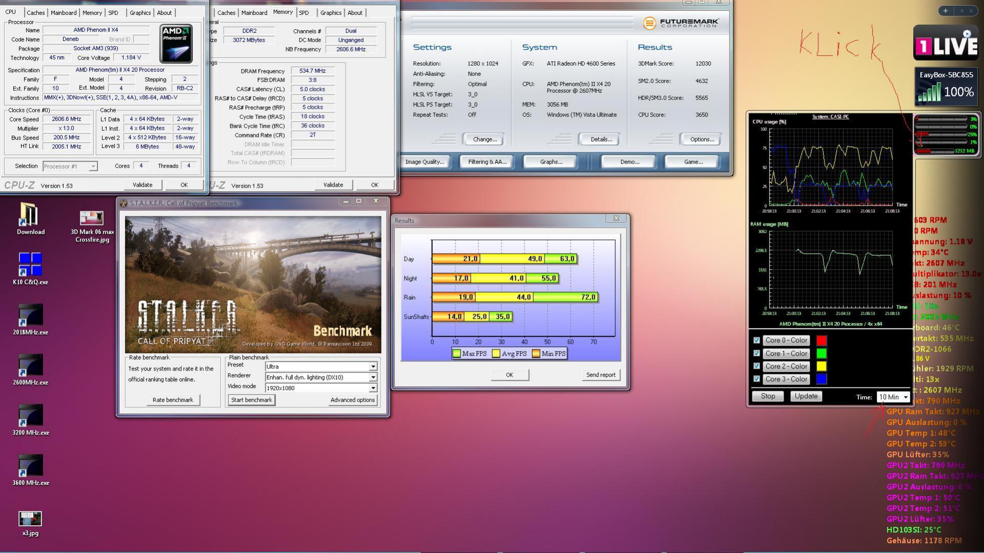 naja also z.b. dirt2 läuft perfekt alles ganz hoch 2xAA mit ca 50frps. sonst hab ich keine games zum vergleichen. irgendwas ist komisch mit dem rechner. der proz wird viel zu heiß über 70° unter volllast, ist zwar nur ein boxed kühler sollte aber trotzdem net so sein. übertakten lässt sich der irgendwie auch net stürtz sofort ab. hab jetzt bestimmt schon 5x die batterie aus dem mainboard gefummelt. bei dem mainboard funktionieren übrigens nur die ersten 2 ramplätze und mein ram wird nur als 800er erkannt. ist aber ein 1000. gibts ne möglichkeit nachzuschauen ob des mainboard irgendein knacks hat?