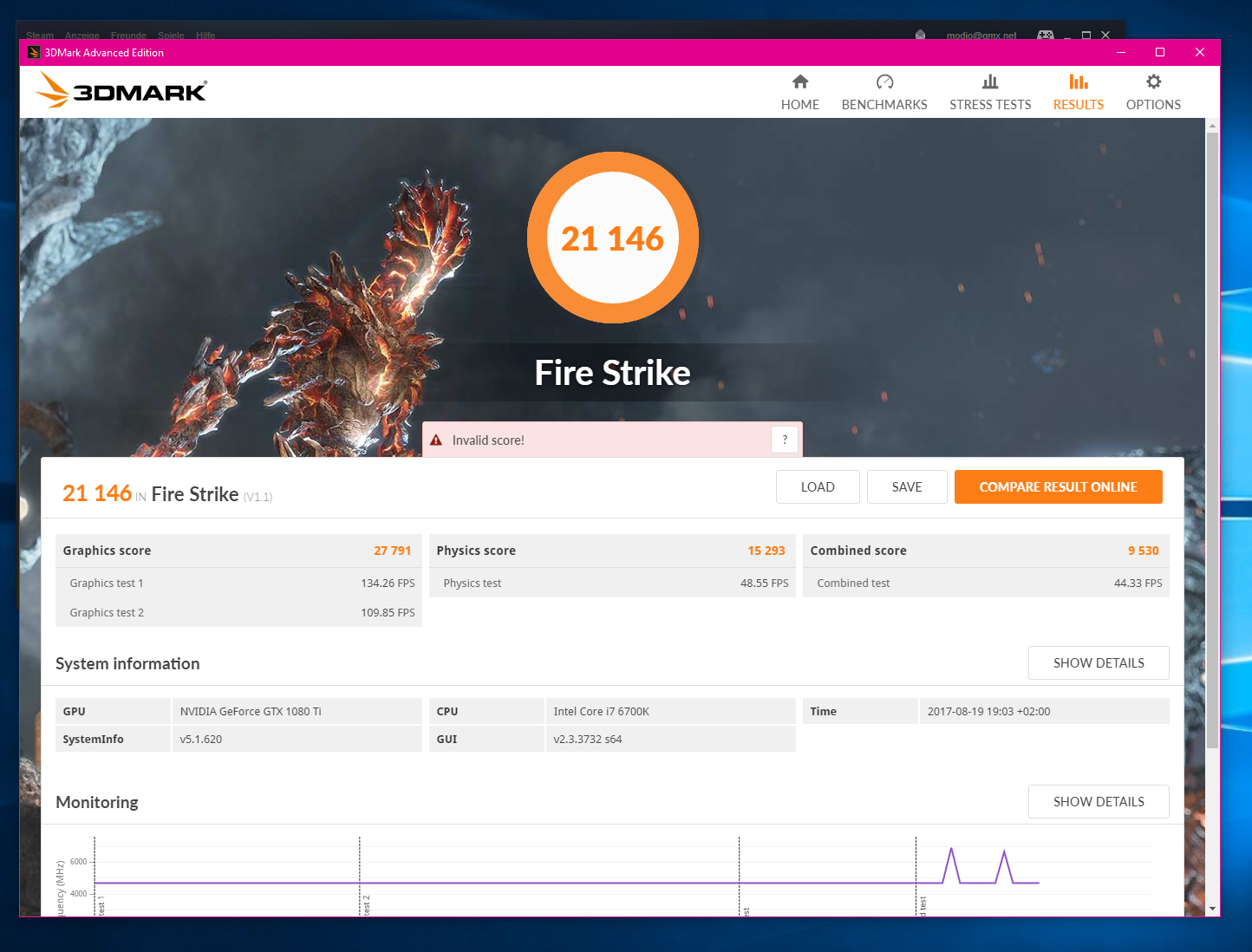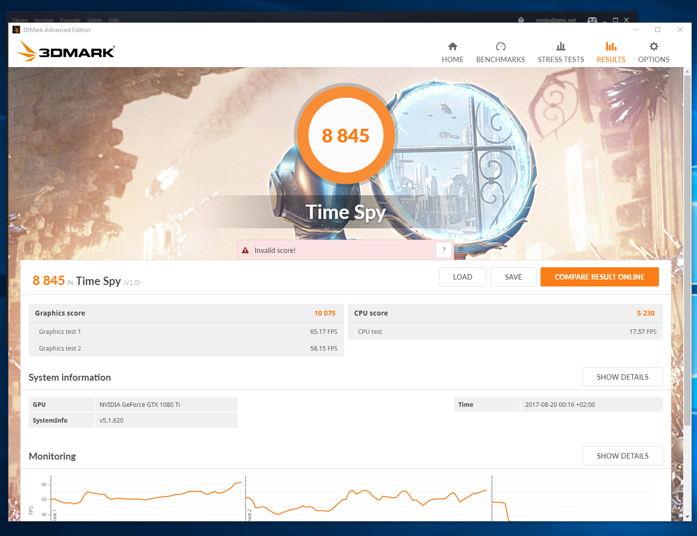 Ich habe daraufhin mal den TimeSpy durchlaufen lassen, sowie den UserBenchmark. Im TimeSpy kommt die Karte bei Guru 3D auf 10.100 Punkte beim Graphics Score. Ich komme mit OC auf gerade mal 9600 Punkte.