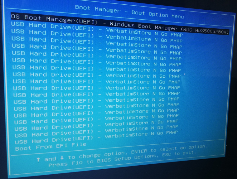 Also Notebook neu gestartet und die Funktionstaste "F9" gedrückt -> Das BIOS Startmenü erscheint. Als erster Eintrag ist das OS aufgeführt, als zweiter Eintrag der USB-Stick, allerdings 18mal!