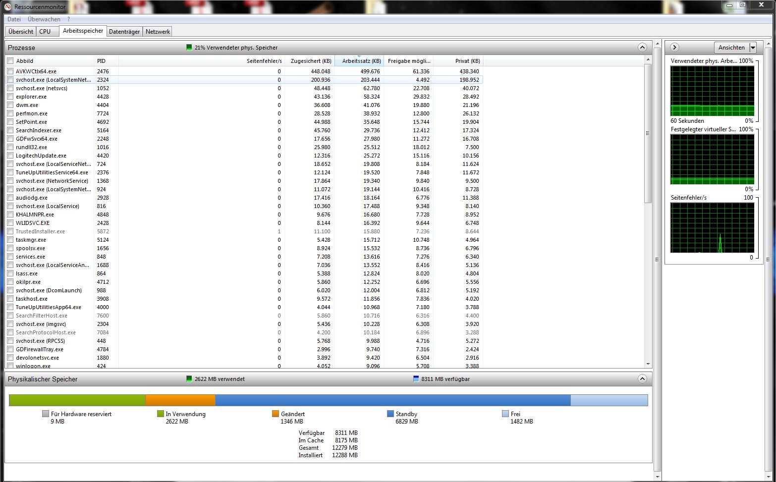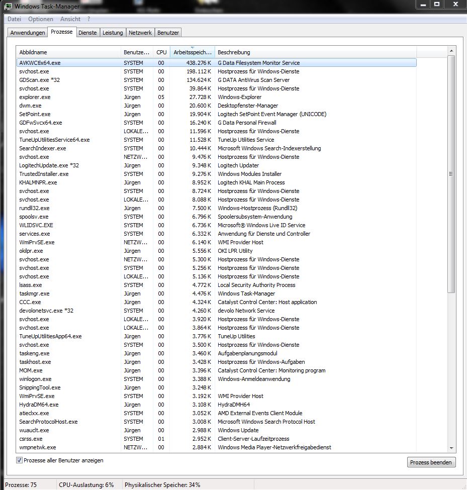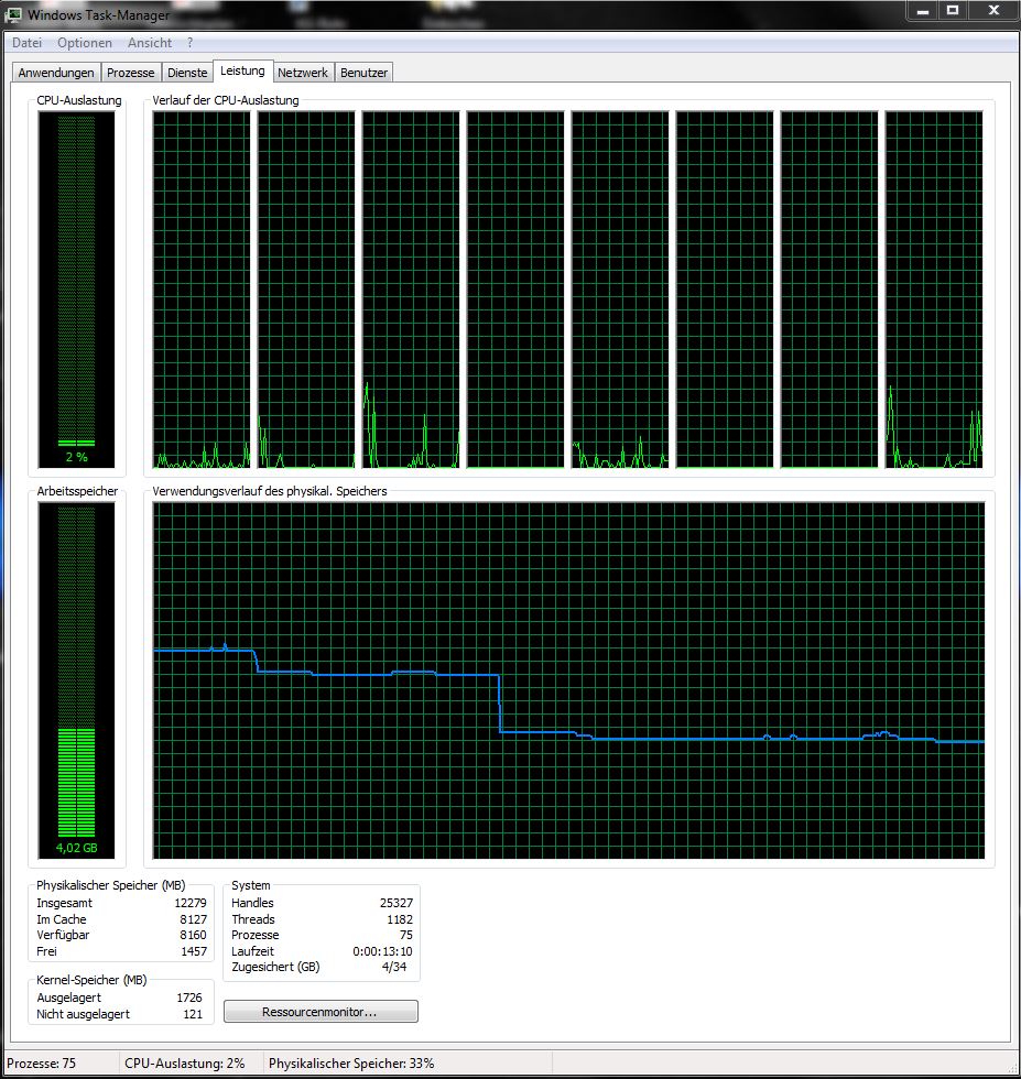 schon kurz nach dem Start (nur Taskmanager geöffnet) steigt die Speicherauslastung eine Zeit lang auf 50 %, sinkt nach einigen Minuten auf ca. 30 %, und bleibt dann in dem Bereich wenn ich keine Programme öffne.