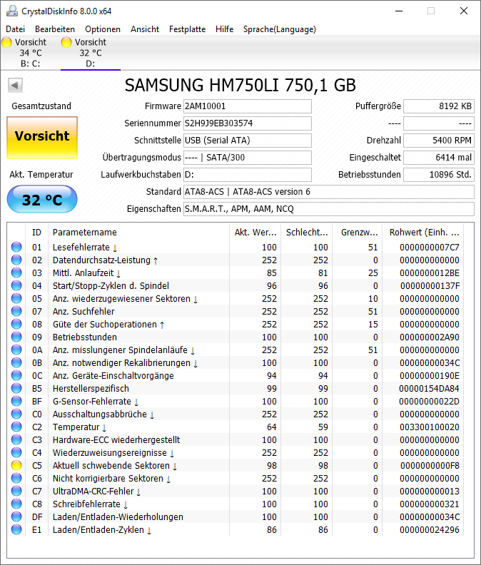 Ich habe mal CrystalDiskInfo laufen lassen: