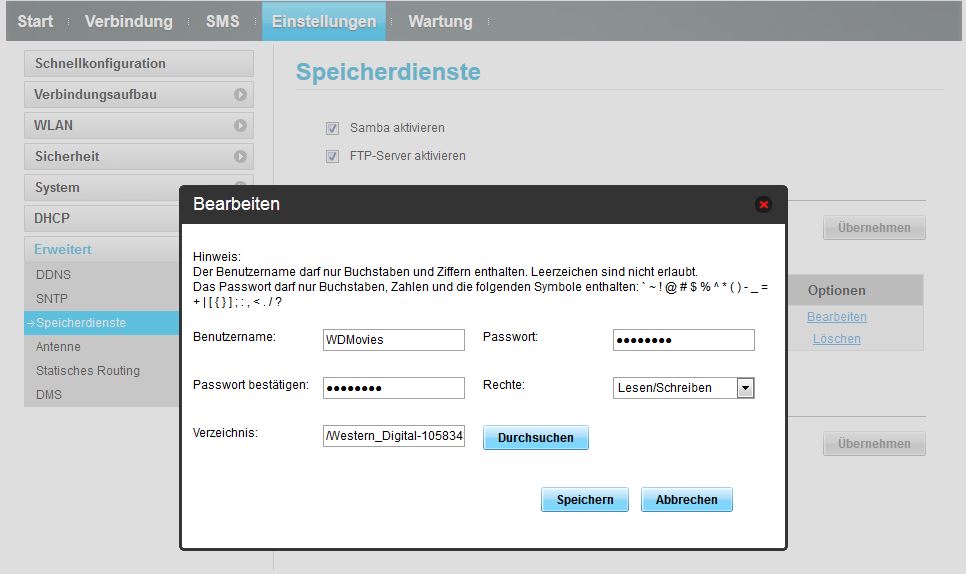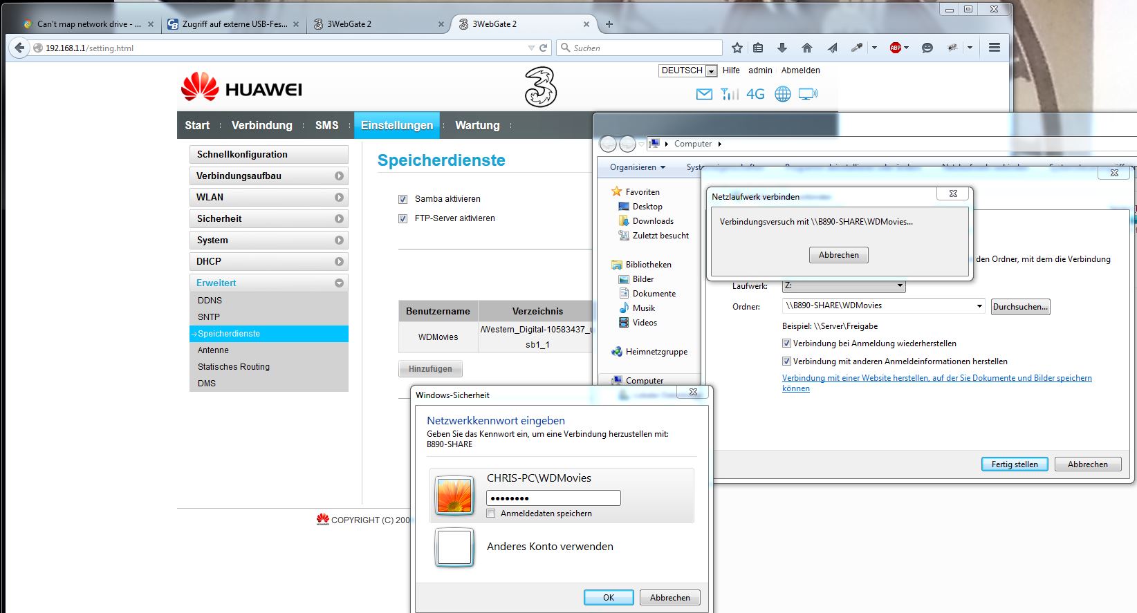 Ich habe meine externe 3,5"-USB-Festplatte an einen Huawei B890 Router gehängt. Sinn und Zweck des ganzen ist es, Filme dort ablegen zu können, damit diese gestreamt werden können, ohne das der PC läuft.