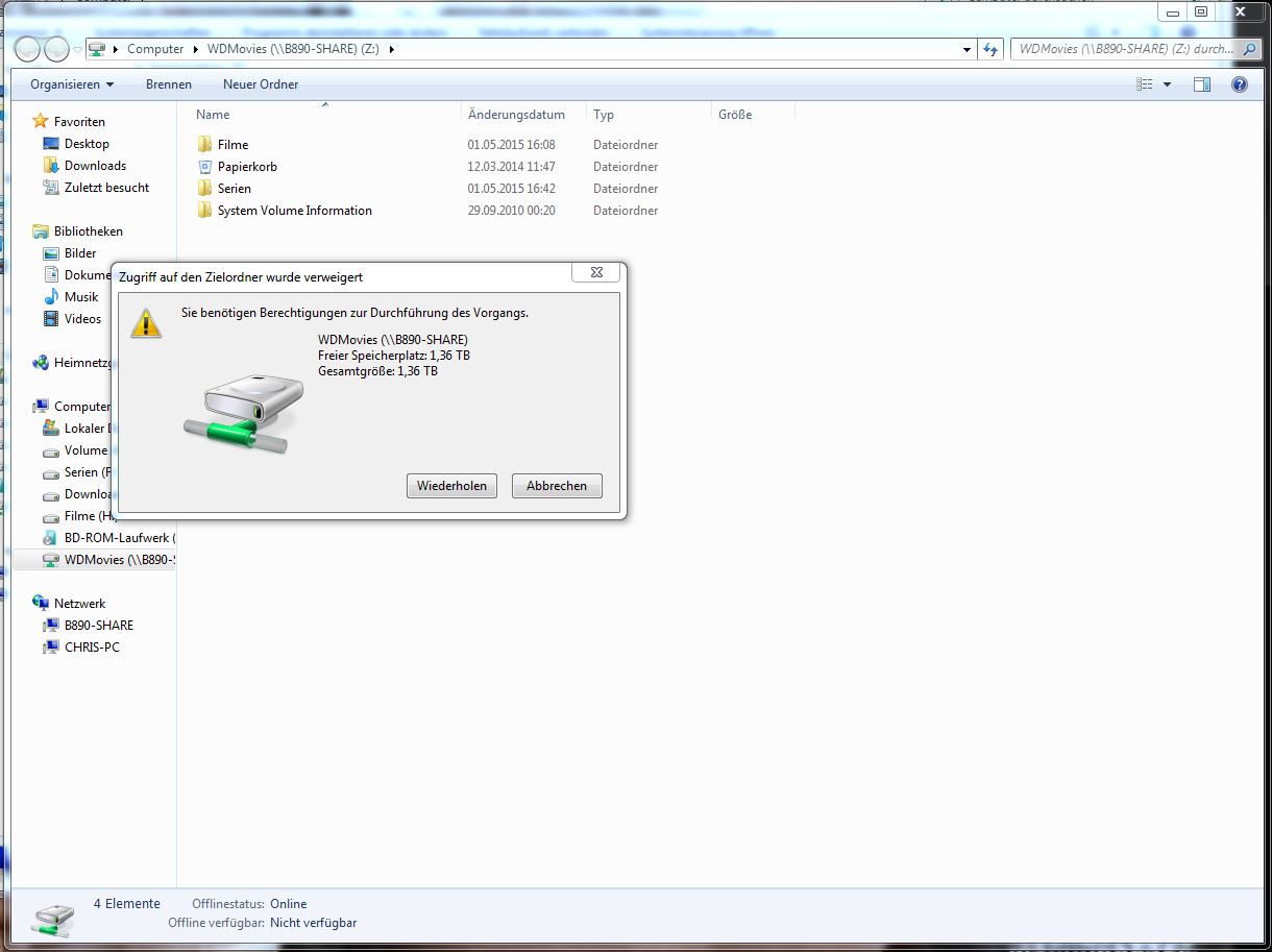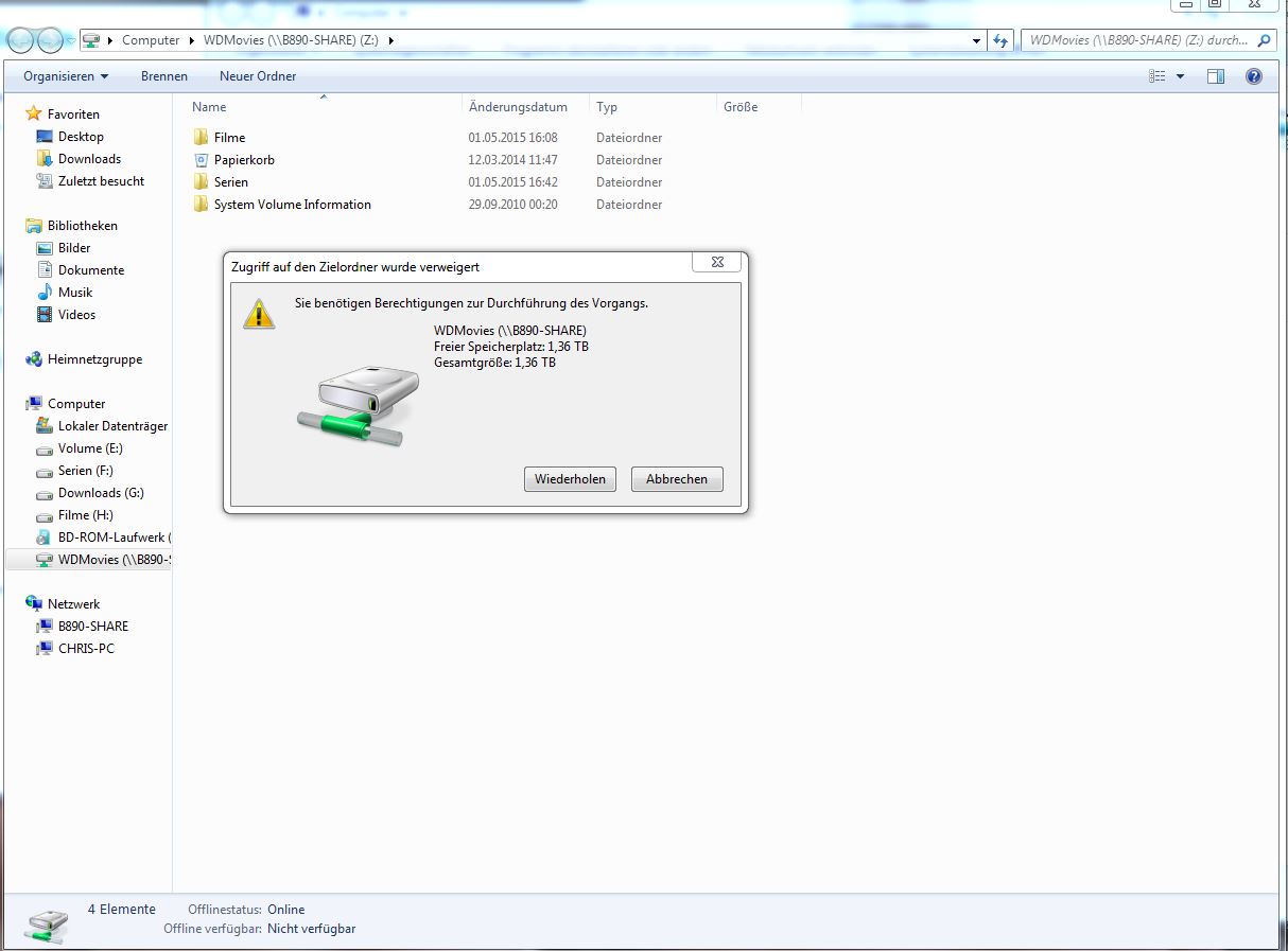 Das funktioniert soweit ganz gut, ich kann das Netzlaufwerk verbinden und habe "Zugriff" auf die Festplatte". Nur kann ich auf der Festplatte einfach keine Daten erstellen oder darauf hin kopieren.