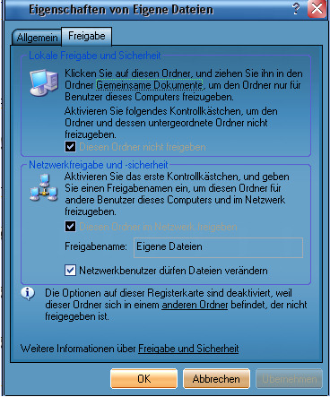 Nimm besser die "normale" Freigabe (unter Extras - Ordneroptionen - Ansicht - 4. Häkchen) und stell damit ein, was du für wen mit welchen Rechten freigeben willst.