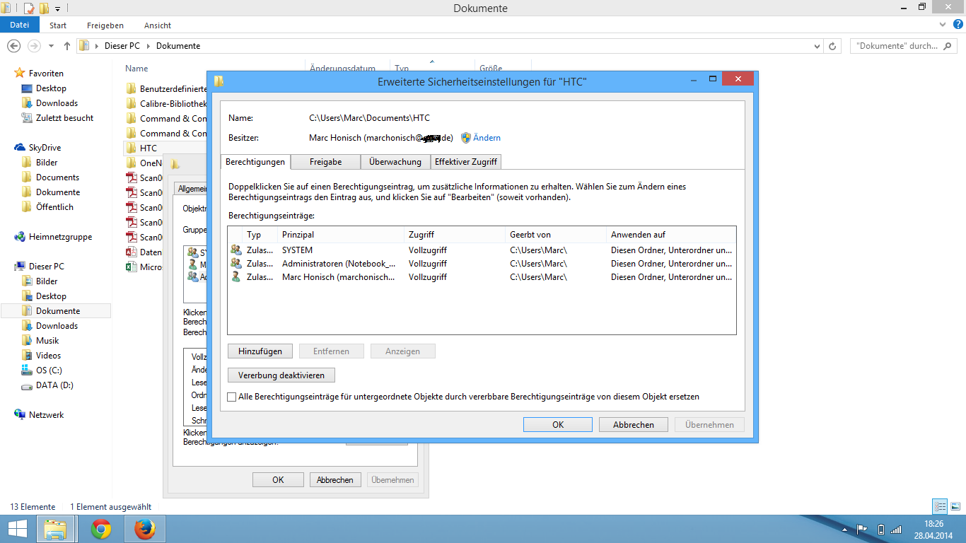 Des Ordners vielleicht, aber nicht aller darin enthaltenen Dateien und Unterordner. Du willst auf "Ändern" klicken, neben deinem Benutzernamen und dann "Besitzer der Objekte und untergeordneten Container ersetzen". Siehe hier: http://blog.blackseals.net/wp-content/uploads/2013/02/windows8_systemdata_uebernahme.jpg Das gleiche machste danach noch für die Berechtigungen und dann bist du deinen Ordner los.