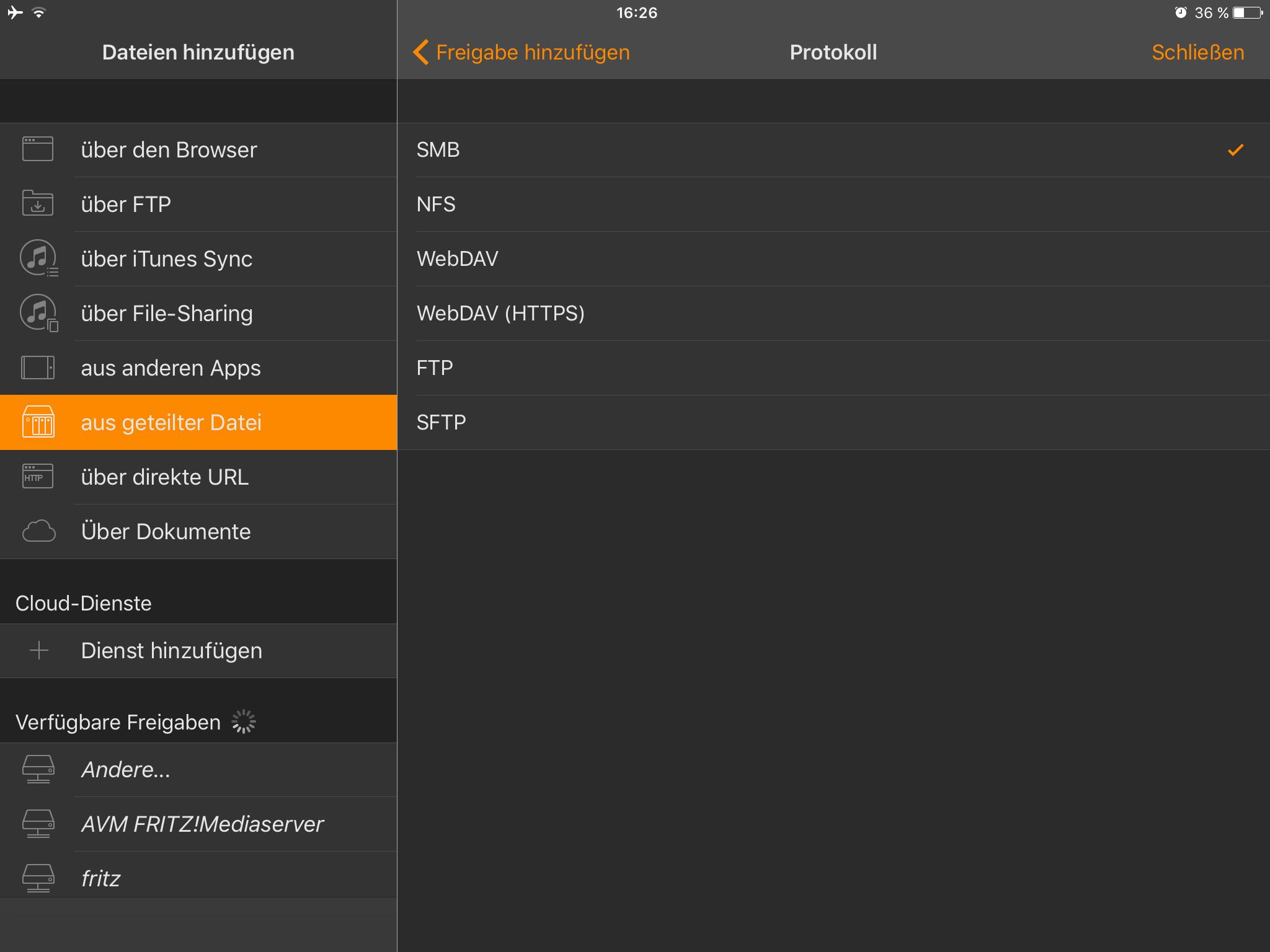 In der App habe ich unterschiedliche Zugriffsmöglichkeiten (SMP, NFS, WebDAV,WebDAV (HTTPS), FTP, SFTP, dierekt über die URL...