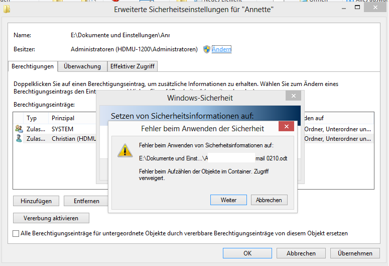 Es geht darum, eine angeschlossene, ehemals unter XP verwendete, Festplatte dazu zu bringen, mir Zugriff zu ermöglichen. Ändere ich nämlich die Berechtigungen eines Ordners, werden die Rechte bei untergeordneten Dateien und Ordnern nicht übernommen (siehe Anhang). Dies trifft auch bei gesetztem Haken (Alle Berechtigungseinträge für untergeordnete...) zu.