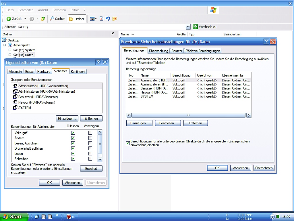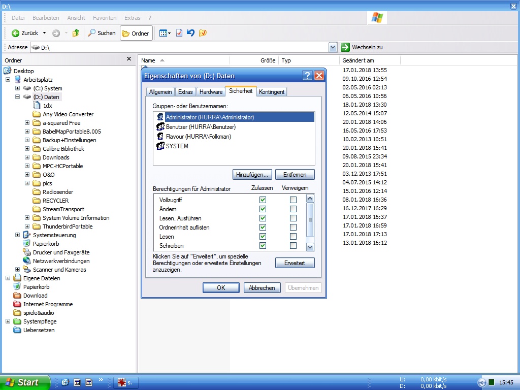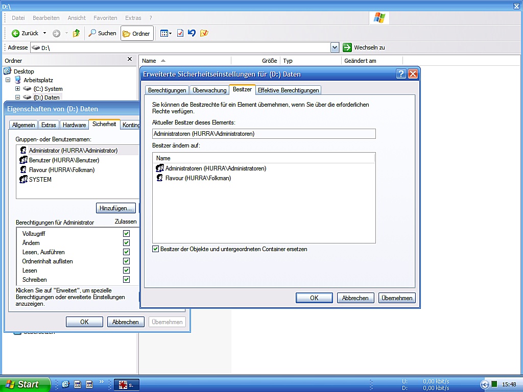 c) Statt meinen eigenen Useraccount, den Account Administratoren als Besitzer beider Partitionen festzulegen (und ebenso an alle Unterordner und Dateien zu weiterzugeben)...