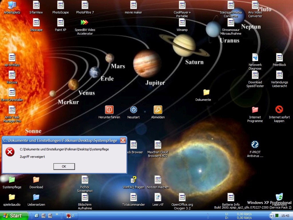 Wie üblich reinigte ich einmal wöchentlich mit drei Cleanern (nacheinander), aber danach konnte ich die auf dem Desktop liegenden Verknüpfungen zu Ordnern nicht mehr per Doppelklick öffnen, jedesmal kam dieses verfluchte "Zugriff verweigert". Hmm, dachte ich, wieso,- ich bin zwar nicht als Administrator direkt, aber doch immer als User mit Administratorrechten eingeloggt?! Und daran rumgestellt hatte ich auch nichts. Ich kam zuerst auf den Gedanken in die Ordneroptionen des Explorers zu gehen, weil vor der "Zugriff verweigert" Meldung immer kurz ein Eingabeaufforderungsfensterchen aufpoppte und husch! - verschwand, bevor ich was darin lesen konnte.