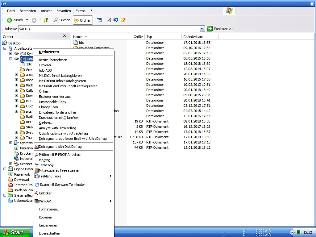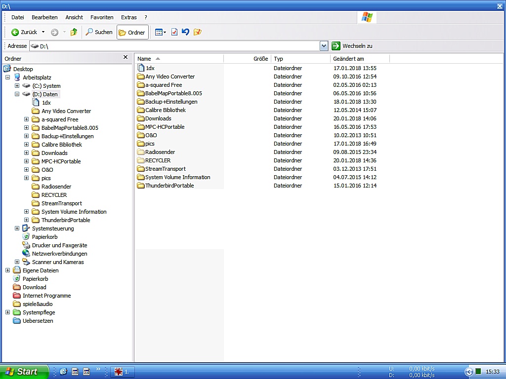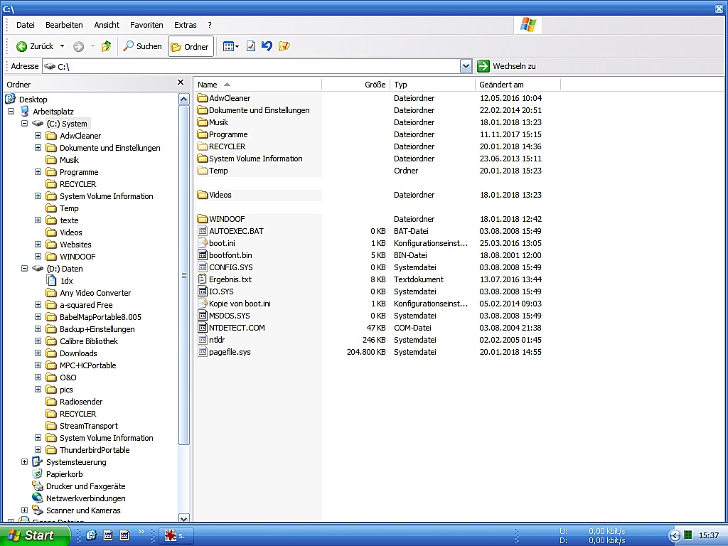 Mein System besteht aus 2 Partitionen, C und D. Auf C liegen Windows XP Pro und die Programme, auf D meine eigenen Dateien.