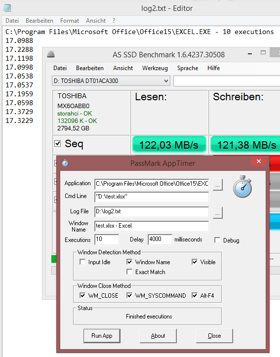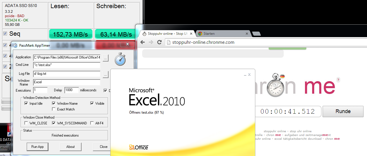 Leider will der Apptimer auf dem zweiten Rechner nicht richtig und schließt mir das Excel schon beim Öffnen, so hab ich 3x per Hand gemessen.
