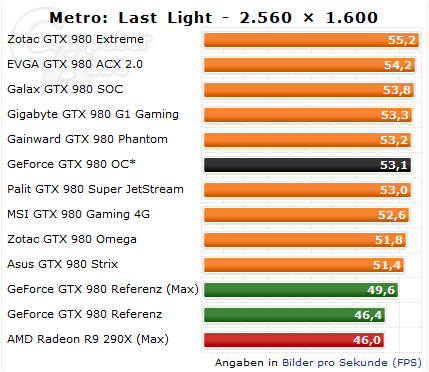 Ich habe jetzt mal den durchschnittlichen Takt der GTX 980 anhand der neun getesteten Partnerkarten ausgerechnet. Dieser liegt bei 1.319 MHz. Rechnet man manuell den von den Herstellern angegebenen durchschnittlichen Boost zusammen, kommt man auf 1.322 MHz - in dem Fall also genau dasselbe. Anhand von Metro: Last Light einmal ein Beispiel, wie das aussehen würde.
