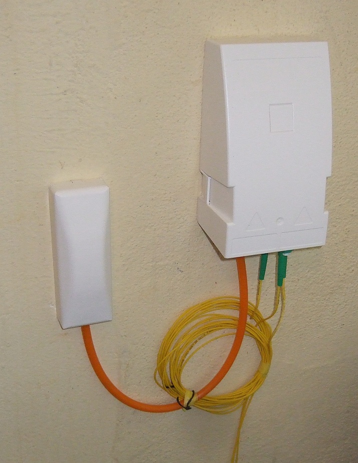 Ein anderer sagt wenn man diese neue Fritzbox nimmt die für Glasfaser ist , wäre das nur ein kleiner Kasten und dann kann das Kabel von da direkt in die Fritzbox.