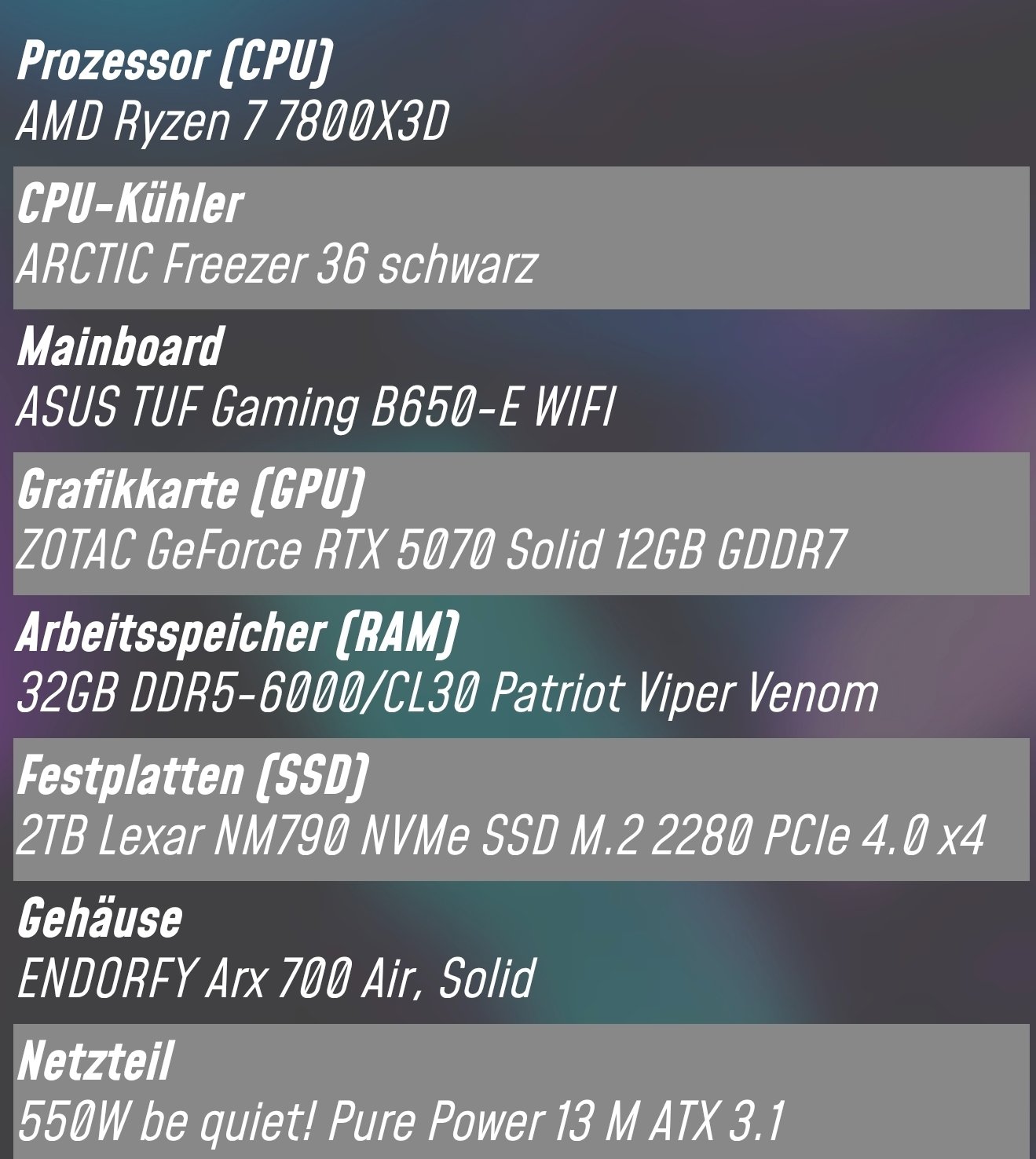 Es war einmal vor langer Zeit, damals hinter den sieben Bergen bei den sieben Zwergen, da konnte man einen 2000€ PC auch mit einer RTX 5080 kriegen... 😅 Davon ist das 850W Netzteil übrig geblieben. Aber heutzutage sollte man sparen, wo es möglich ist.