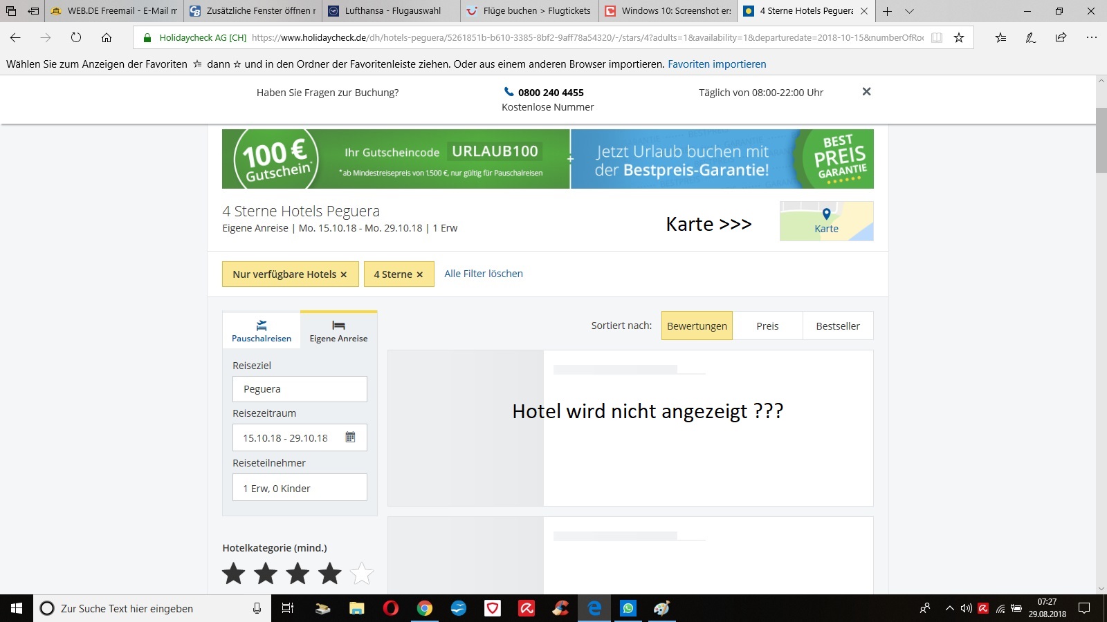 Ich suche gerade nach einem Urlaub. Wenn ich z.B. auf die Seite von Holiday Check gehe und mir eine Region ausgesucht habe, klicke ich dann immer auf die Karte. Um zu sehen wo die Hotels in der Region liegen. Dieses Fenster startet aber öffnet nicht ! Habe das mit dem Internet Explorer, Opera und Google Chrome versucht. Bei jedem das selbe.