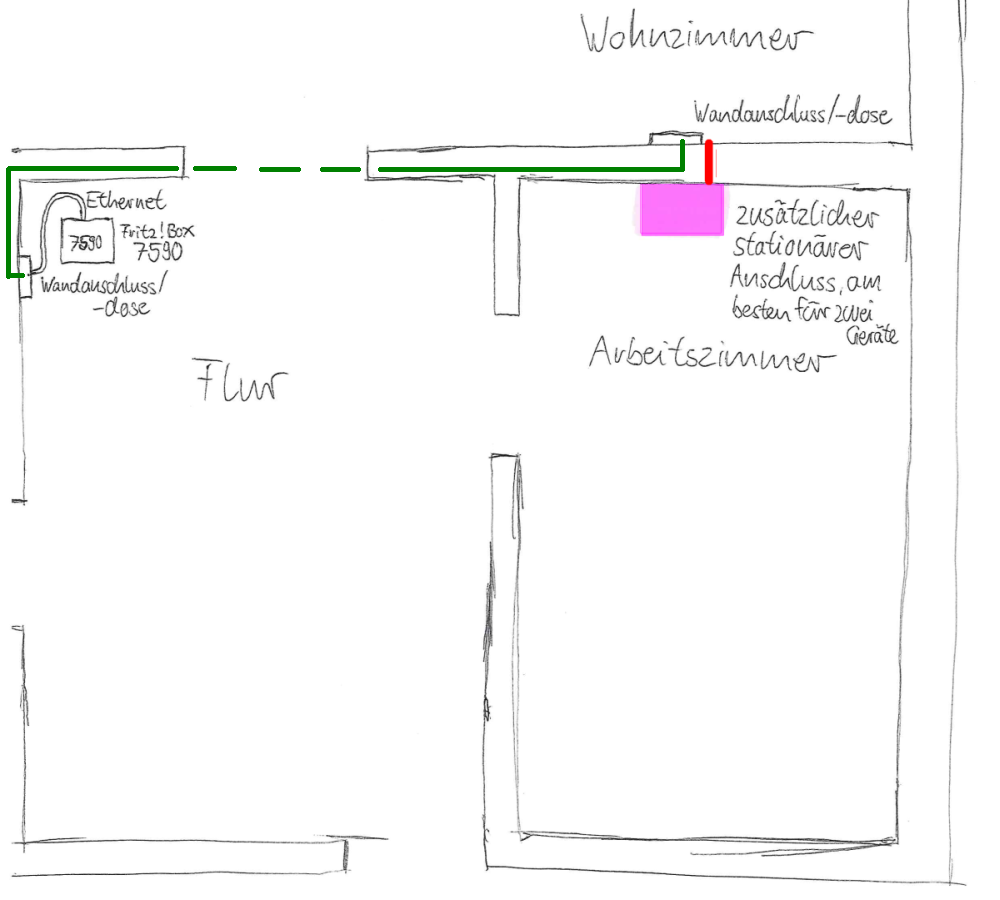 So stellt sich die Lage in der Wohnung dar. Links in der Ecke des Flures ist die Telefonbuchse, an der meine Fritz!Box 7590 hängt. Daneben die LAN-Buchse. Die grüne Linie beschreibt den (vermutlichen) Weg des Ethernetkabels durch die Wand. Es endet an der Buchse im Wohnzimmer. Dort kann ich zwar meinen Smart TV nun per Kabel mit dem Internet verbinden, aber eigentlich brauchts das nicht. Filme sehe ich auf Blu-ray, selten über Streaminganbieter. Wichtiger wäre mir die Dose in die andere Richtung, ins Arbeitszimmer, weil dort mein Computer steht/stehen soll (pinkes Rechteck).