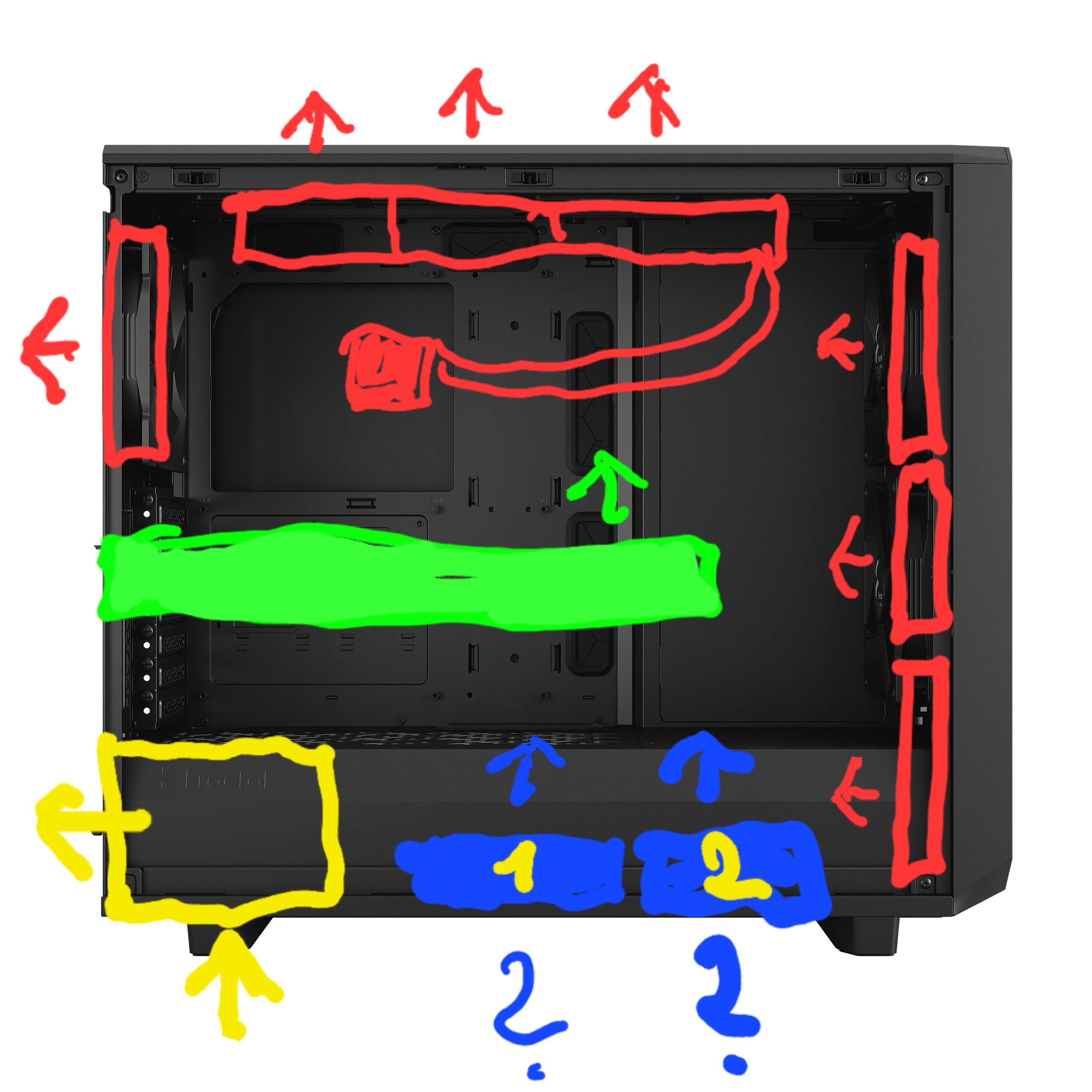 Da ich einen Lüfter übrig habe und das erste mal auch Platz, habe ich mir überlegt unter die GPU einen zu verbauen (blau mit einer gelben 1). Dem Netzteil (gelb) nehme ich ja nichts weg und von unten frische Luft anziehen wäre gut?