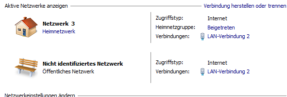 Ich habe die Situation, dass ich auf dem neu installierten PC im Netzwerk- und Freigabecenter die Anzeige von zwei Netzwerken habe, zum einen das Netzwerk 3, was als Heimnetzwerk bezeichnet ist und zum zweiten ein nicht identifizierbares Netzwerk, was als öffentliches Netzwerk bezeichnet wird.