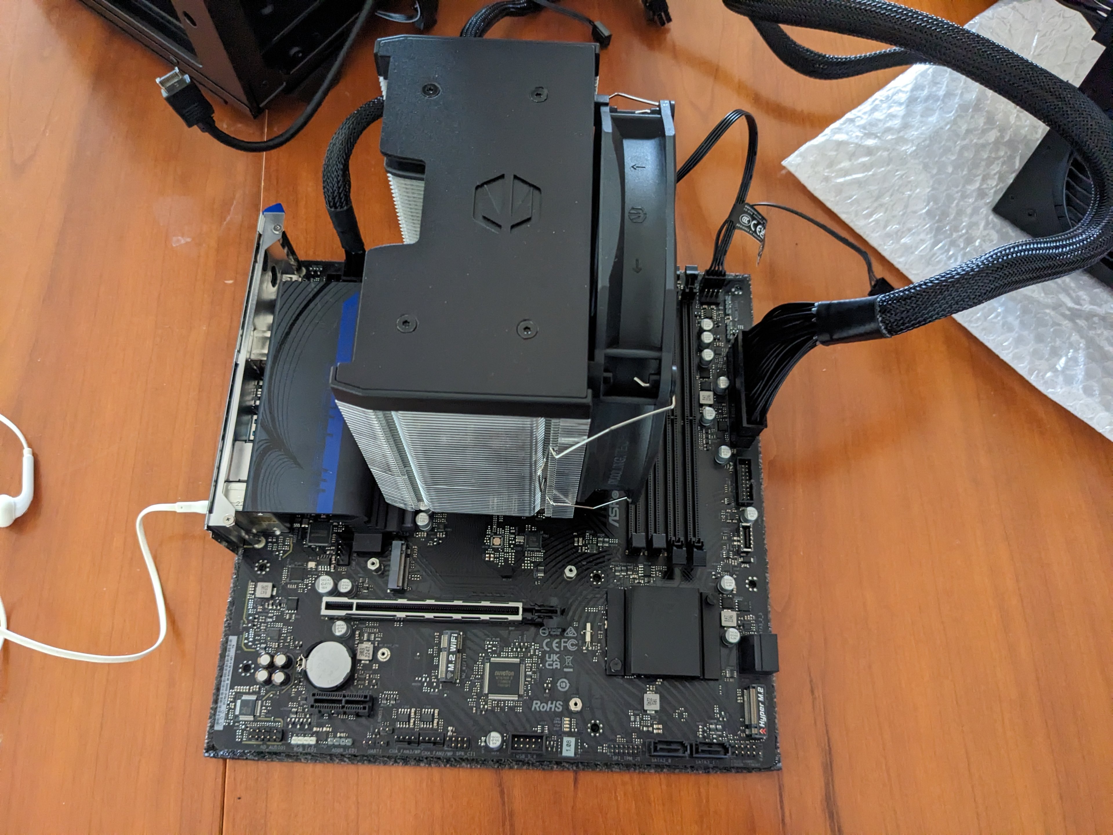 Leider scheitere ich beim Zusammenbau. Ich habe zwar alles zusammengesteckt, aber beim ersten Start hat das Mainboard nur kurz geblinkt und die Lüfter sind auch nicht angegangen. Mittlerweile habe ich versucht, vom Anfang an mit der Null-Methode zu testen - also nur Stromversorgung für CPU und Mainboard und CPU-Lüfter angesteckt und dann mit Kopfhörern versucht, den Beep zu hören.