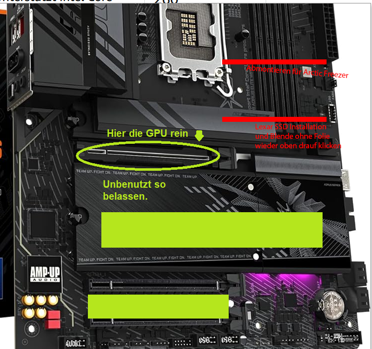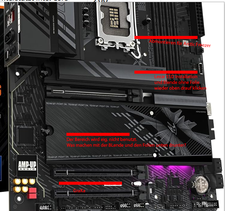 Meine erste Frage betrifft die Blenden (siehe Screenshot anbei) auf dem Mainboard. Ich benötige grundsätzlich nur die obere, direkt unter der CPU, für meine Lexar SSD.