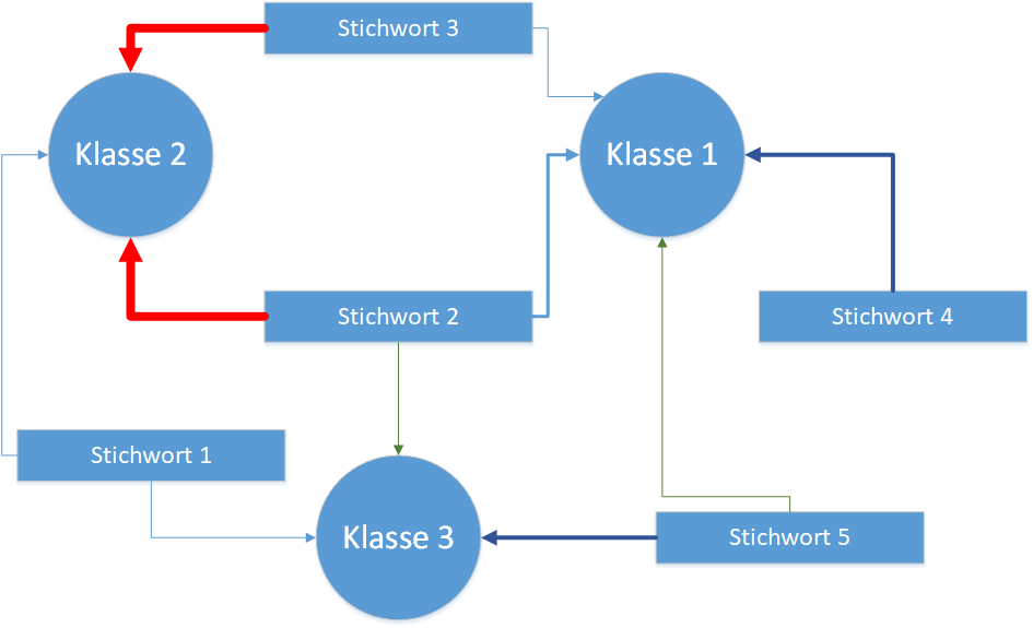 Nun möchte ich herausfinden ob es einen Zusammenhang zwischen bestimmten Stichwörtern und einer bestimmten Klasse gibt. Dabei hab ich mir das so gedacht, dass wenn ein Stichwort sehr oft mit einer Klasse zusammenhängt die Linie dicker wird.