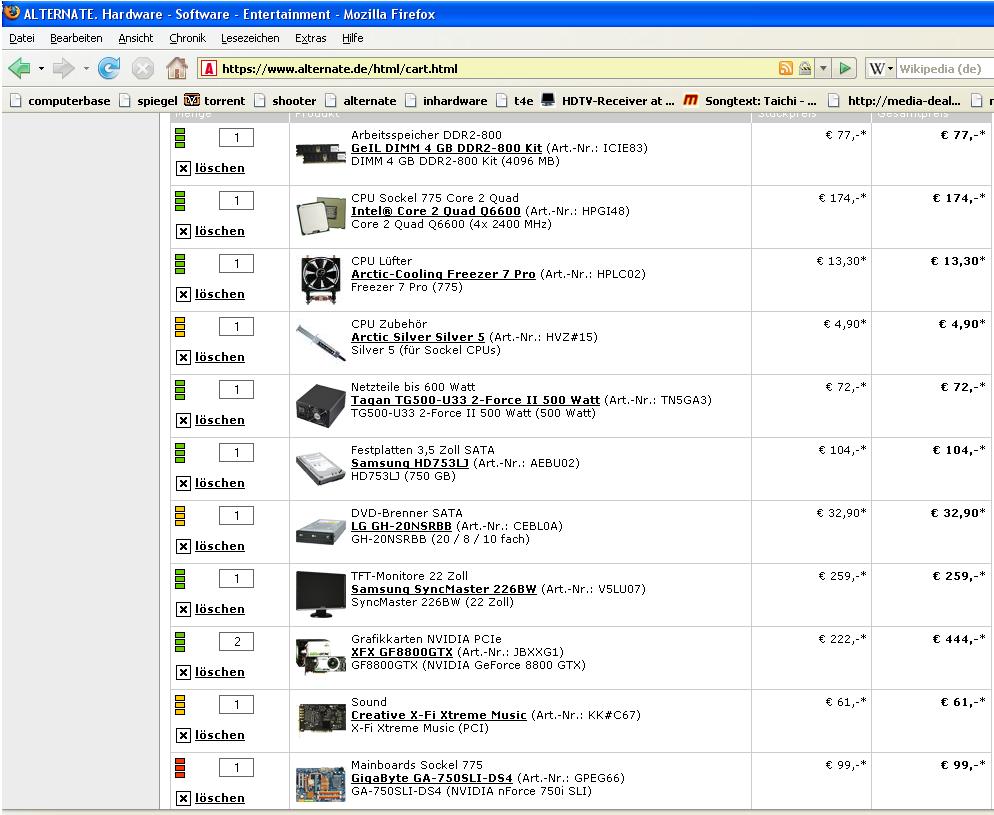So habe dir ein System zusammen gestellt. Ich habe mich für SLI entschieden da du anscheinend drauf besteht. Ich habe 2x 8800GTX genohmen, da die sind besser als die 38x2 und die 98gx2. Der Kühler für den Prozessor reicht auch vollkommen. Du musst nur noch ein Gehäuse aussuchen! Auf eine andere Seite wirst du die ganzen Komponenten billiger kriegen, weil alternate nicht der billigste anbieter ist! Ups mir ist da ein Fehler beim Netzteil unterlaufen, du brauchst ja 4x 6polige anschlüsse such dir einfach ein anderes.