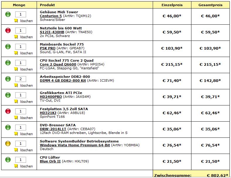 Hmmm, bei hardwareversand bekomme ich eine gescheite Konfiguration für 885,- hin. Wenn Du jemanden hast, der dir den PC zusammenbaut, würde ich bei mix-computer.de bestellen. Da gehts auch für knapp 800,- (günstigerer Speicher, anderes Board, Kleinigkeiten abgeändert)