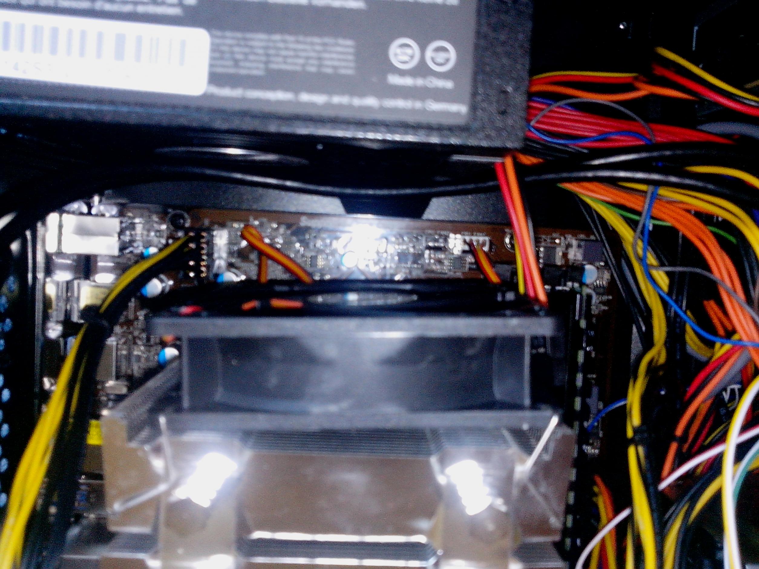 Zudem ZIEHT dein Lüfter, der schepp aufm Kühler sitzt, die Luft da raus. Vermutlich wäre ein Anbringen dessen darunter besser. Auch mit den Streben nach oben, also quasi einfach unter den Kühler setzen. Nicht optimal, aber typisch AMD halt.