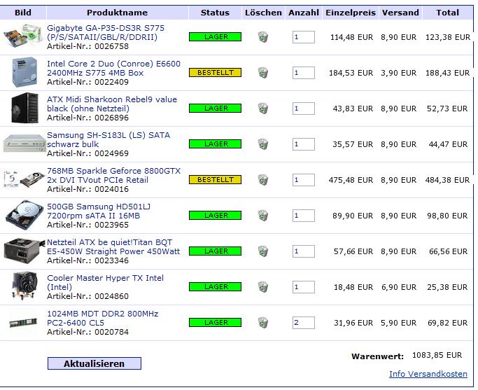 - CPU: Ist fix. Habe ihn auf die kommenden Preissenkungen des Q6600 aufmerksam gemacht,wollte er aber nicht haben. Ein 6000+ kommt nicht in Frage, da das Teil nur als Heizung zu gebrauchen ist. Außerdem wollte er unbedingt Intel.